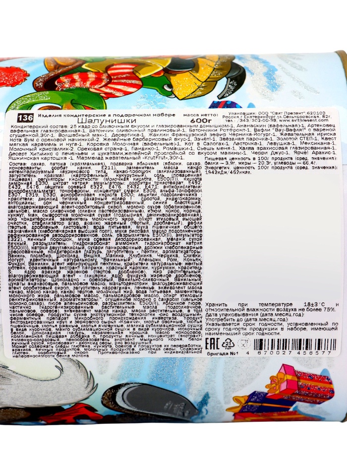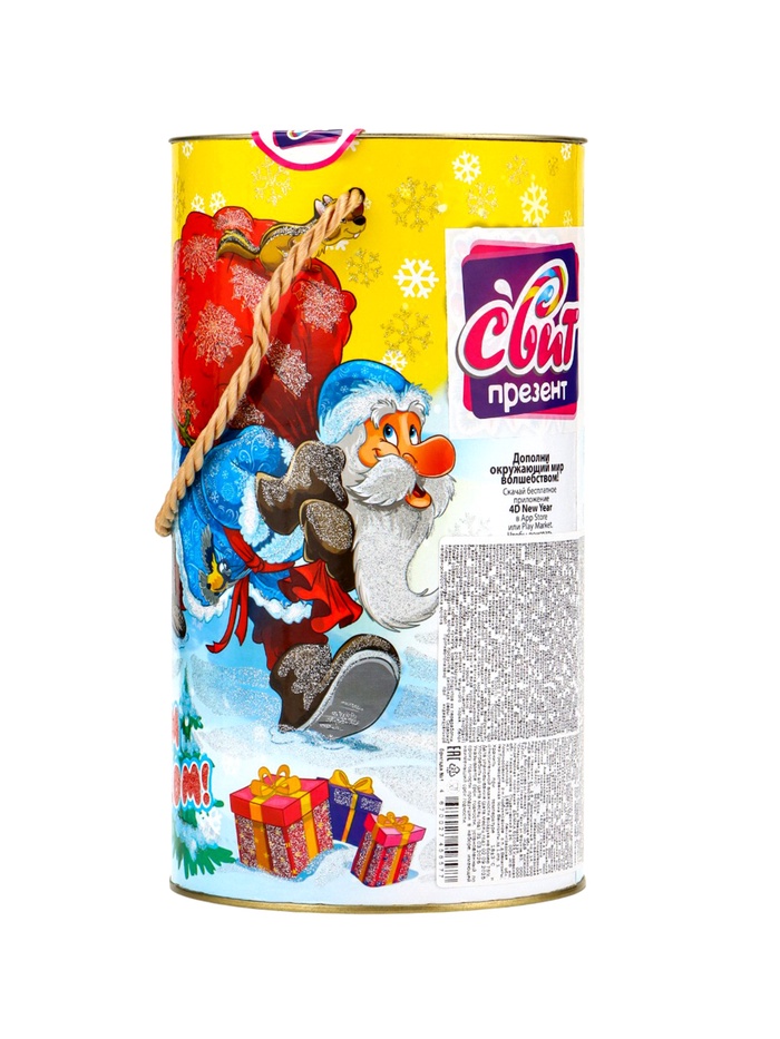 Габариты: 12,5 x 12,5 x 22; Страна: Россия; В боксе: 7 шт; Состав: См. на упаковке; Материалы: см. на упаковке; Фасовка: по 1 шт; Индивидуальная упаковка: Тубус; Сертификат: ЕАС; Цвет: МИКС; Для кого: Унисекс; В наборе, шт.: 33; Вес нетто, г: 600; Вид упаковки: Металлический тубус; Тематика праздника: Рождество, Новый год; Адресат: Девочке, Мальчику; Материал: Металл; Составляющие набора: Конфеты; Возраст: Для детей