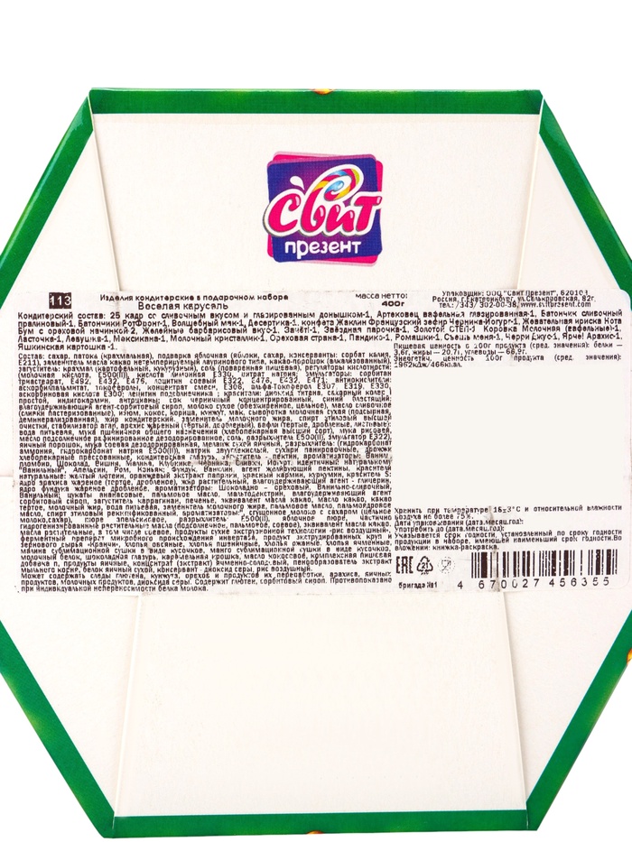 Создайте праздничное настроение с набором сладостей! Новогодний сладкий подарок «Веселая карусель» весом 400 г — удобный комплект угощений в картонной коробке для детей.
