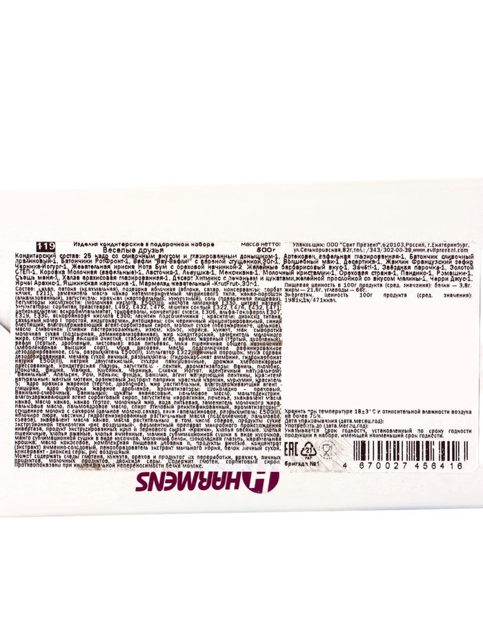 Габариты: 19 x 16 x 7,5; Страна: Россия; В боксе: 12 шт; Состав: См. на упаковке; Материалы: см. на упаковке; Фасовка: по 1 шт; Индивидуальная упаковка: Без упаковки; Сертификат: ЕАС; Цвет: МИКС; Для кого: Унисекс; В наборе, шт.: 29; Вес нетто, г: 500; Вид упаковки: Коробка картонная; Тематика праздника: Рождество, Новый год; Адресат: Мальчику, Девочке; Материал: Картон; Составляющие набора: Конфеты; Возраст: Для детей
