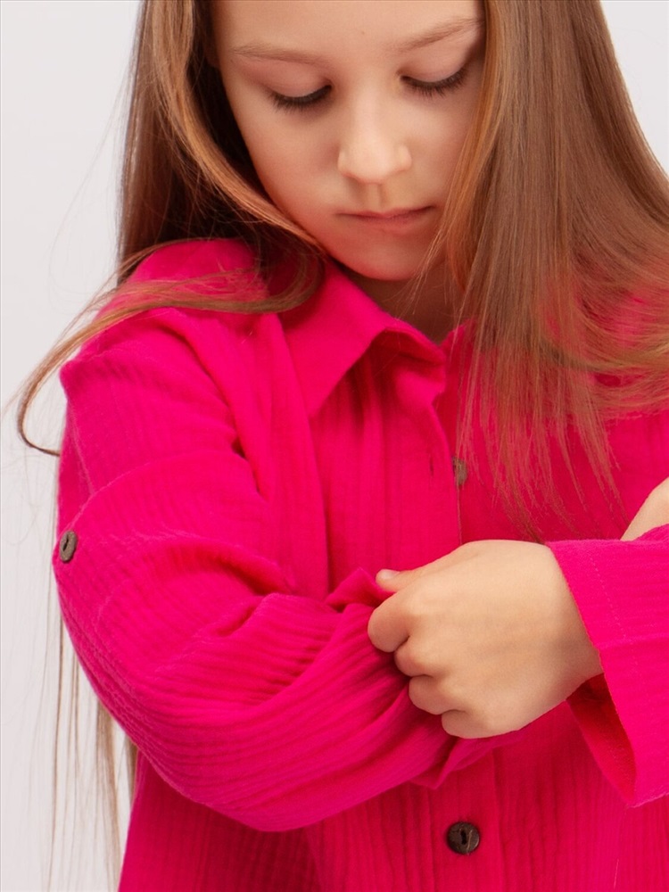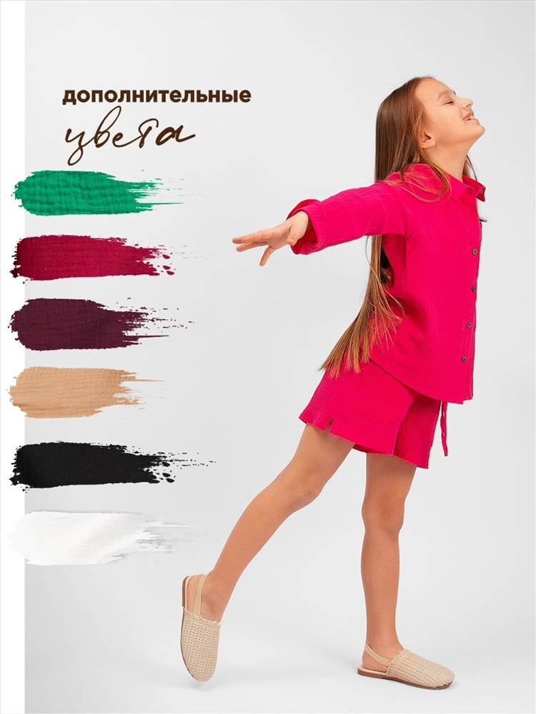 Костюм для девочки Соль&Перец свободного кроя. Рукава можно зафиксировать с помощью паты и пуговицы из кокоса. Ткань-двухслойный муслин, хорошо пропускает воздух, защищает от солнца, идеально подходит для чувствительной кожи. Отличный выбор для летнего отдыха.