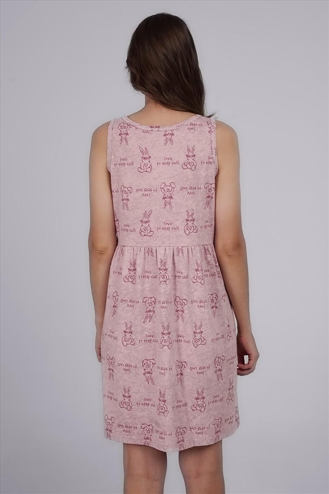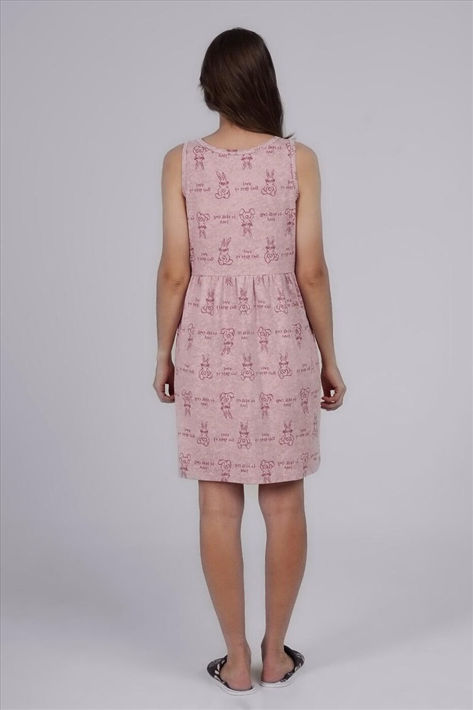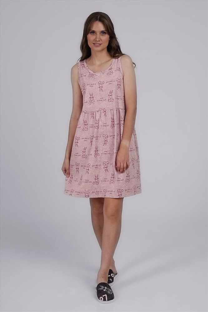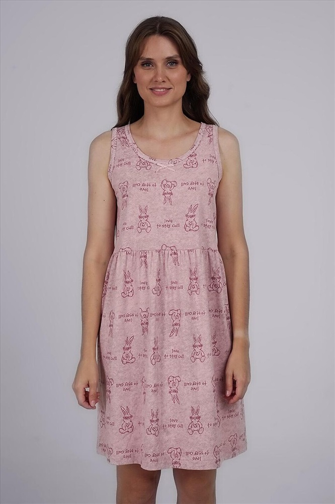 Сорочка ночная для дома из хлопкового трикотажного полотна на широких бретелях. Горизонтальный рез чуть выше линии талии. Низ немного расклешён. Округлая горловина. По горловине и пройме окантовка с застилом. Спереди по горловине бант. Состав: 100% Хлопок