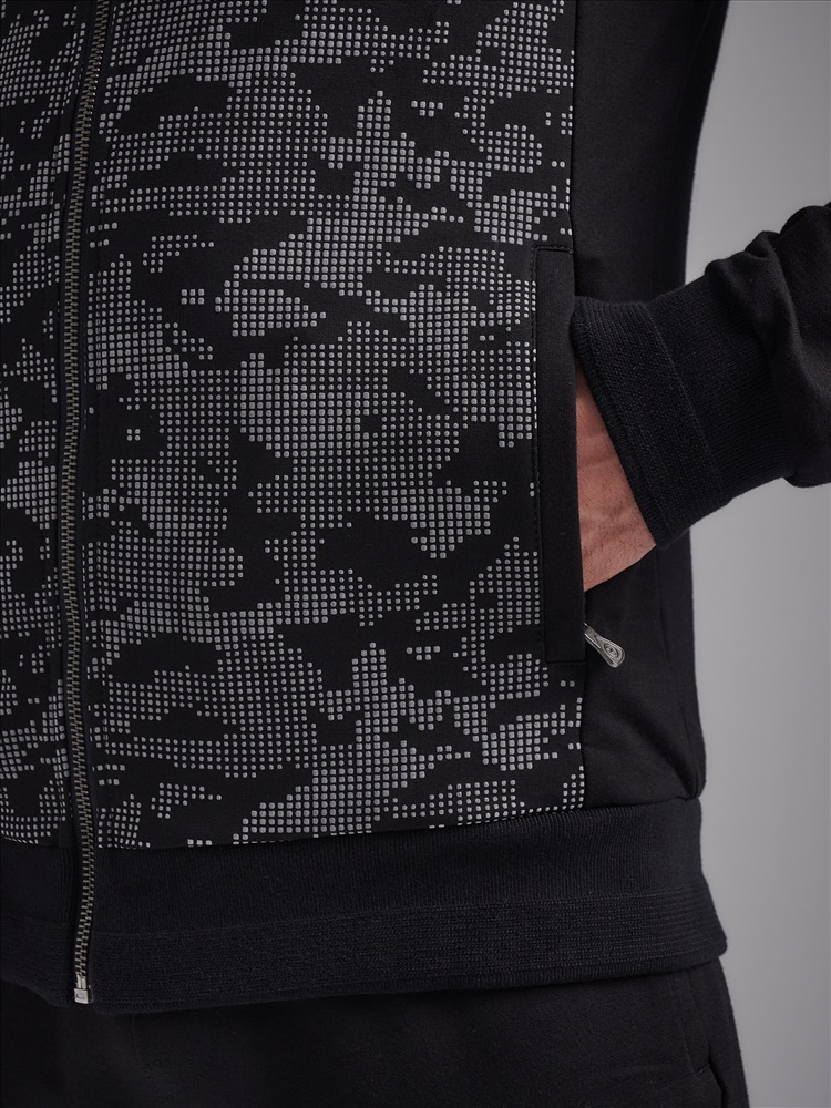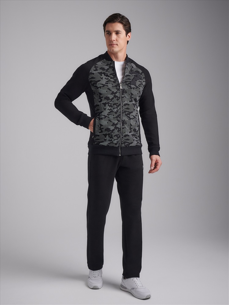 Спортивный костюм из хлопкового трикотажного полотна. Куртка костюма на поясе, с воротником - стойкой, застегивается на молнию. Перед и спинка куртки – из трикотажного полотна с объемным принтом. Рукава покроя реглан. Карманы куртки и брюк с молниями, закрытыми планками, в рельефах. На груди куртки слева фирменная вышивка. Пояс и манжеты куртки изготовлены из плотного эластичного полотна с серыми полосами. Брюки прямые. Пояс брюк по линии талии с эластичной резинкой, дополнительно регулируется шнуром. На левом рукаве и под левым карманом шеврон с фирменным логотипом.