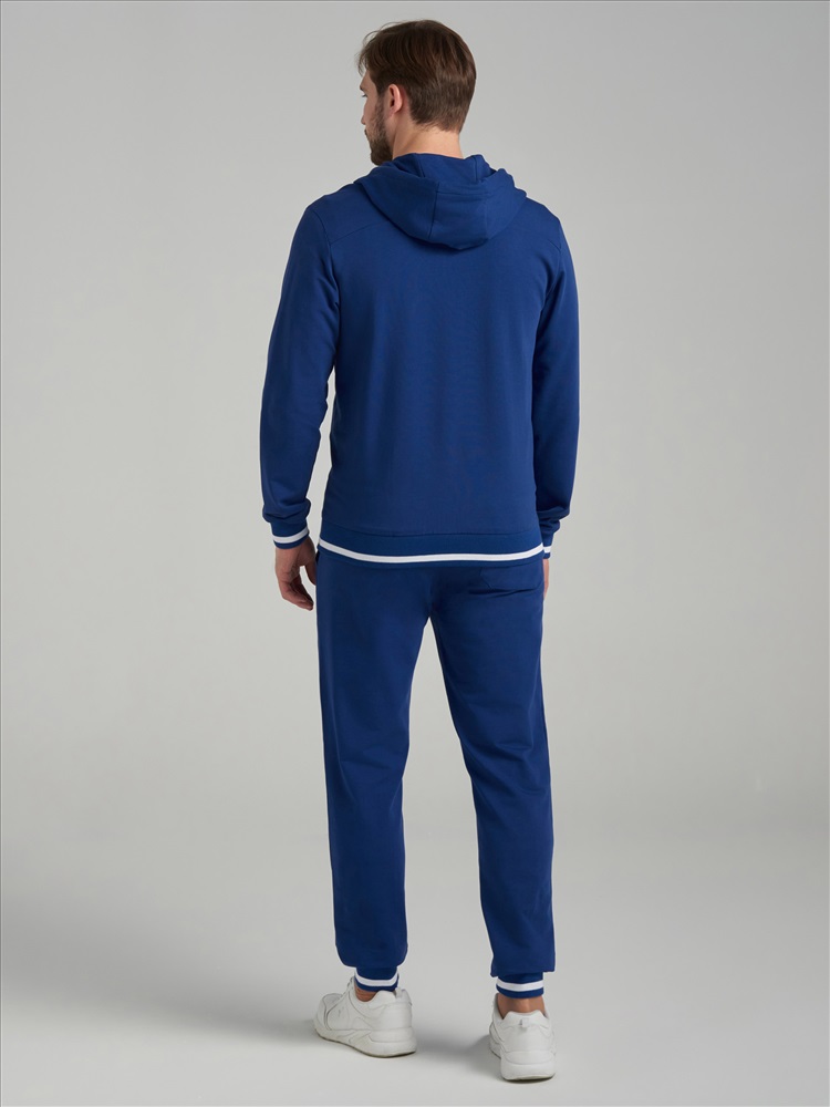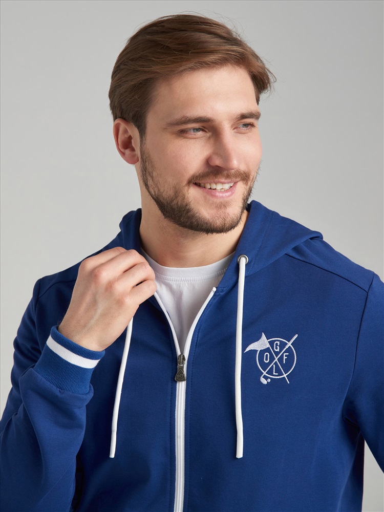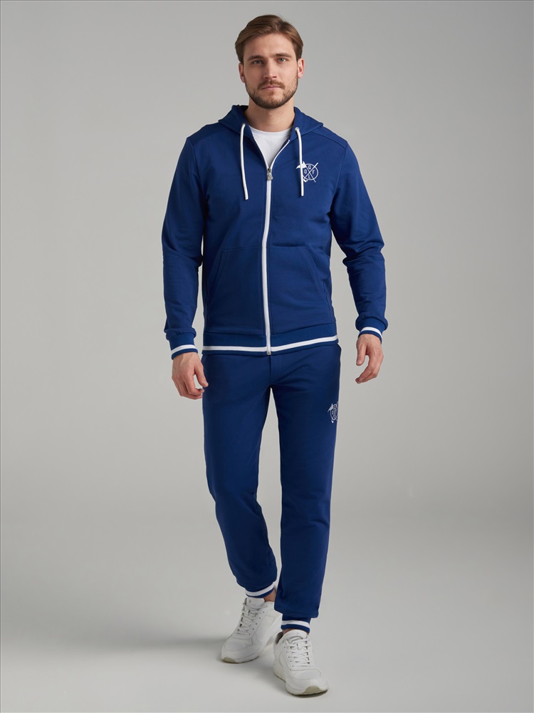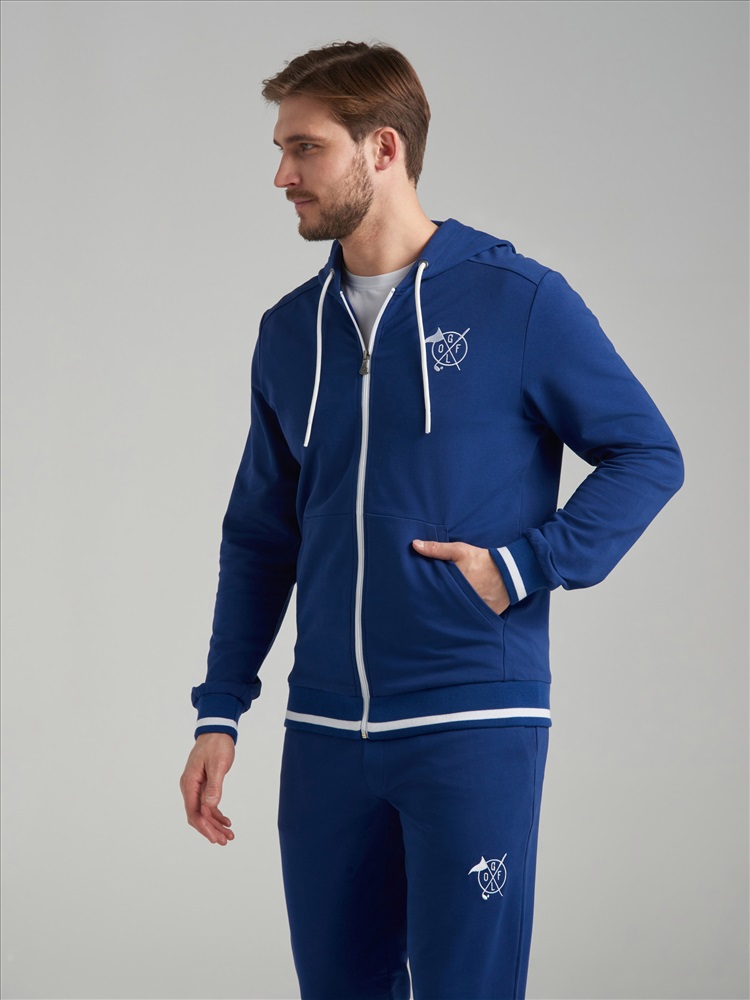 Спортивный костюм из хлопкового трикотажного полотна. Куртка костюма на поясе, с капюшоном, застегивается на молнию. Рукава втачные. Куртка с карманом "кенгуру". Лицевая часть капюшона регулирется шнуром. Пояс и манжеты куртки изготовлены из эластичного подвяза с белыми полосами. Брюки зауженные ,с манжетами. Пояс брюк по линии талии с эластичной резинкой так же дополнительно регулируется шнуром. На левой груди и под левым карманом белая вишивка GOLF.