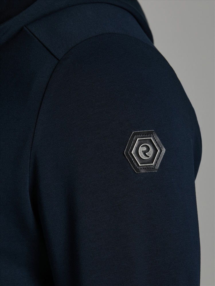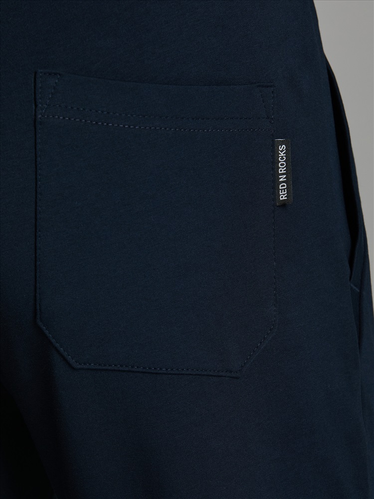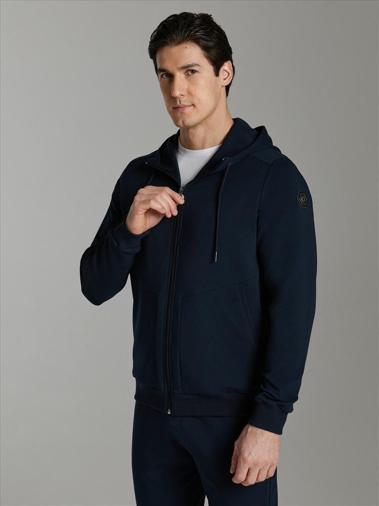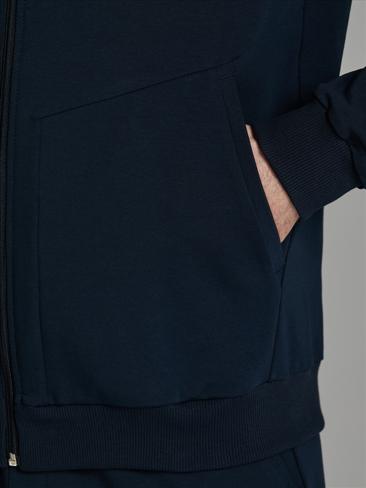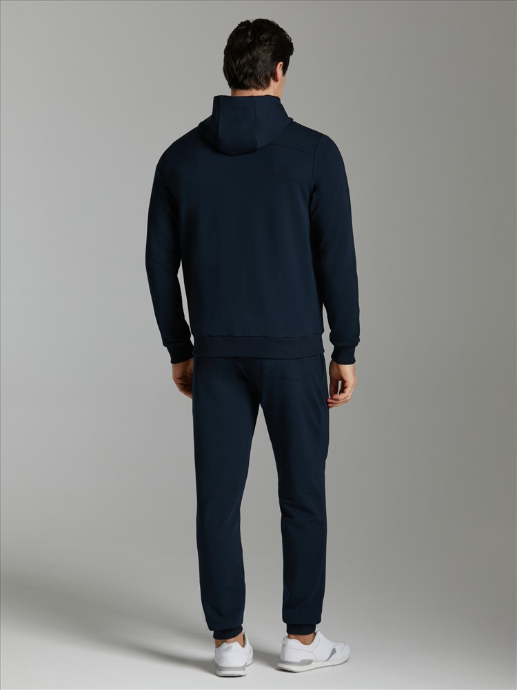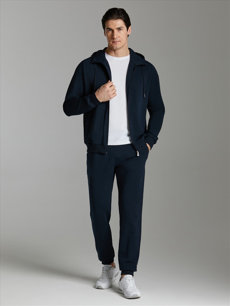 Мужской артикул 11M-RR-1828 темно-синего цвета спортивный костюм изготовлен из хлопкового трикотажного полотна с эластаном. Костюм состоит из удобной куртки на поясе, с капюшоном и высокой стойкой, куртка застегивается на молнию. Удобные вместительные карманы выполнены в подрезах. Брюки прямого силуэта, заужены книзу эластичными манжетами. Справа на задней половинке брюк есть дополнительный накладной карман. На левом рукаве – шеврон с фирменным логотипом. Пояс брюк по линии талии с эластичной резинкой, дополнительно регулируется шнуром.