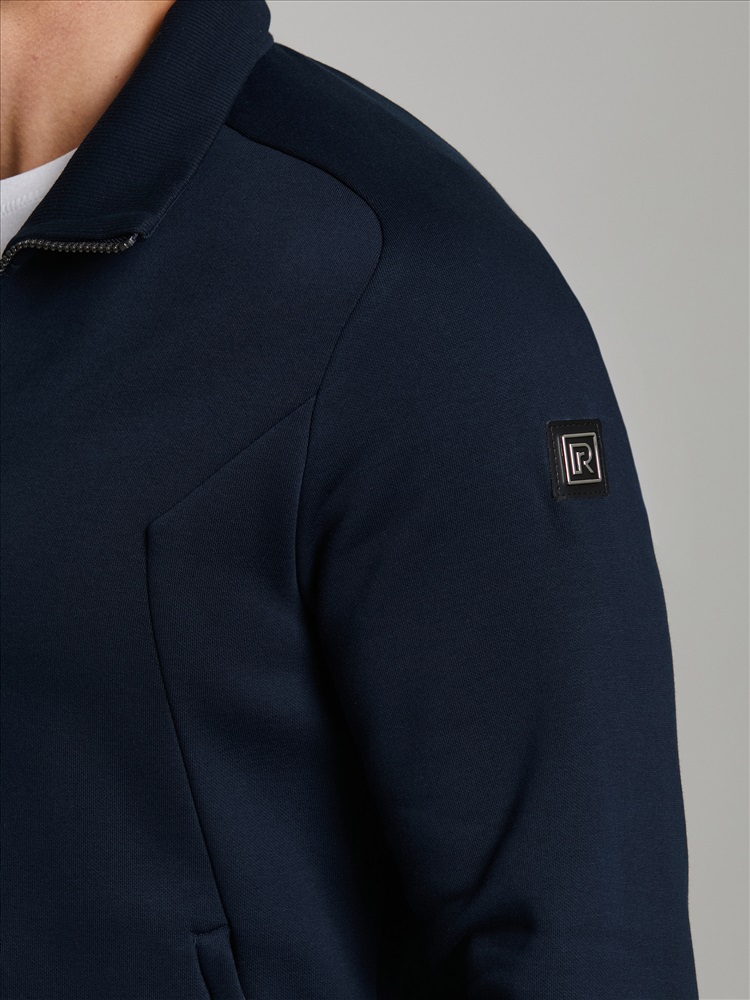 Мужской артикул 12M-RR-1863 темно-синего цвета спортивный спортивный костюм из хлопкового трикотажного полотна с изнаночным начесом. Костюм состоит из удобной куртки на поясе, с воротником-стойкой, куртка застегивается на молнию. Рукава покроя реглан. Угловые рельефы по переду куртки переходят в удобные наклонные карманы с молниями. На рукаве слева настрочен фирменный шеврон с металлическим логотипом. Пояс, воротник и манжеты куртки изготовлены из эластичного подкладочного материала. Карманы брюк с молниями так же выполнены в подрезах боковой вставки. Брюки прямого силуэта, слегка заужены книзу. Пояс брюк по линии талии с эластичной резинкой, дополнительно регулируется шнуром. Костюм создан для комфортного отдыха и тренировок в прохладное время года.