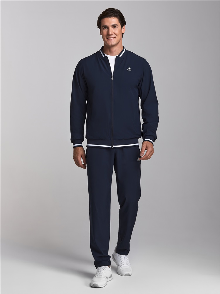Костюм изготовлен из легкой плащевой ткани. Куртка на молнии прямого силуэта с воротником-стойкой, подкладкой из легкой трикотажной сетки. Крой рукавов - реглан. Прорезные карманы с планкой, с молниями. Манжеты и пояс курки из эластичного трикотажного подвяза с белыми полосами. Брюки прямого силуэта, без подкладки. Спереди на брюках прорезные карманы с планками, так же застегиваются на молнию. Низ брюк слегка заужен эластичной тесьмой. Пояс брюк выполнен с широкой эластичной резиной, дополнительно фиксируется шнуром. На груди куртки слева и под левым карманом брюк - шеврон с фирменным логотипом.