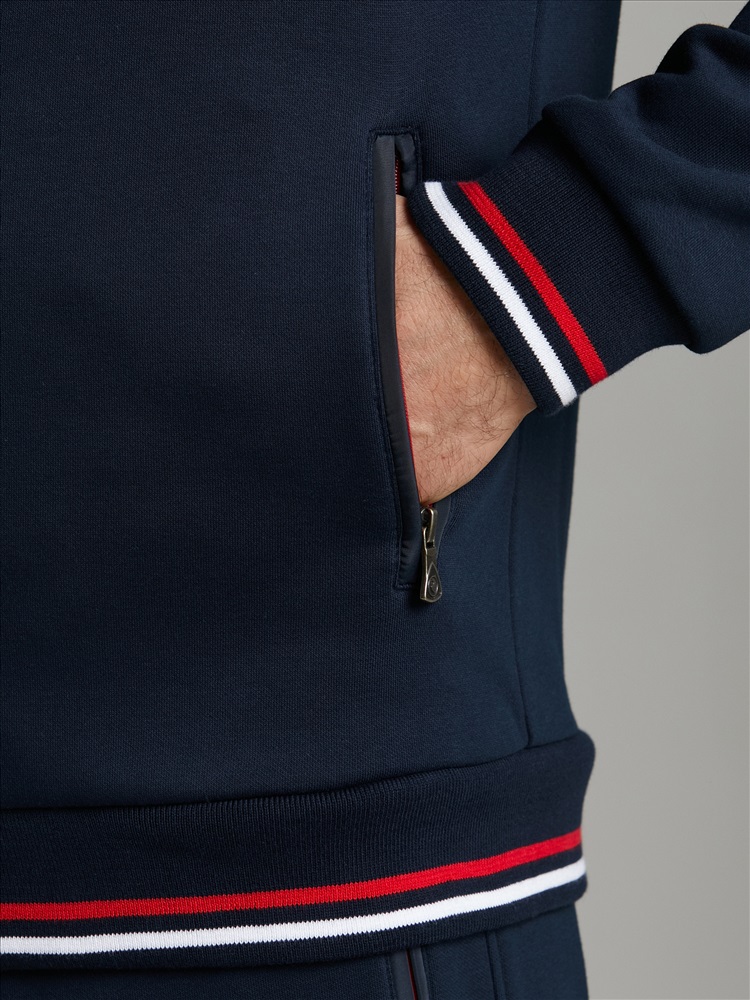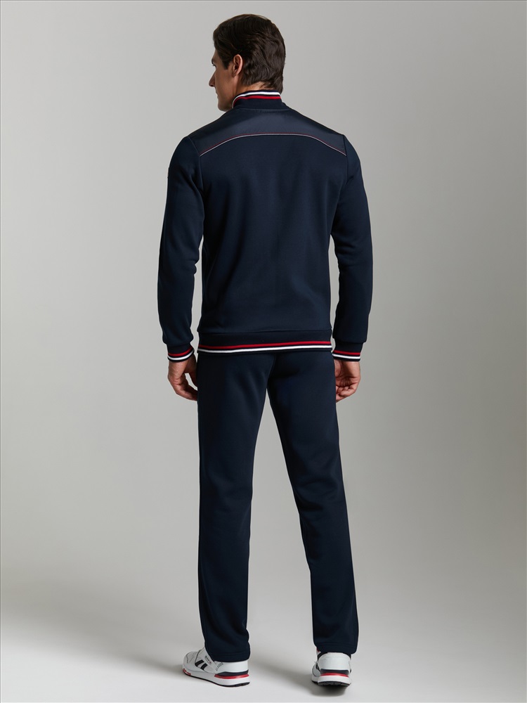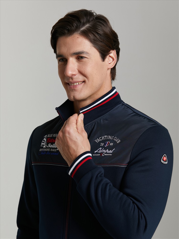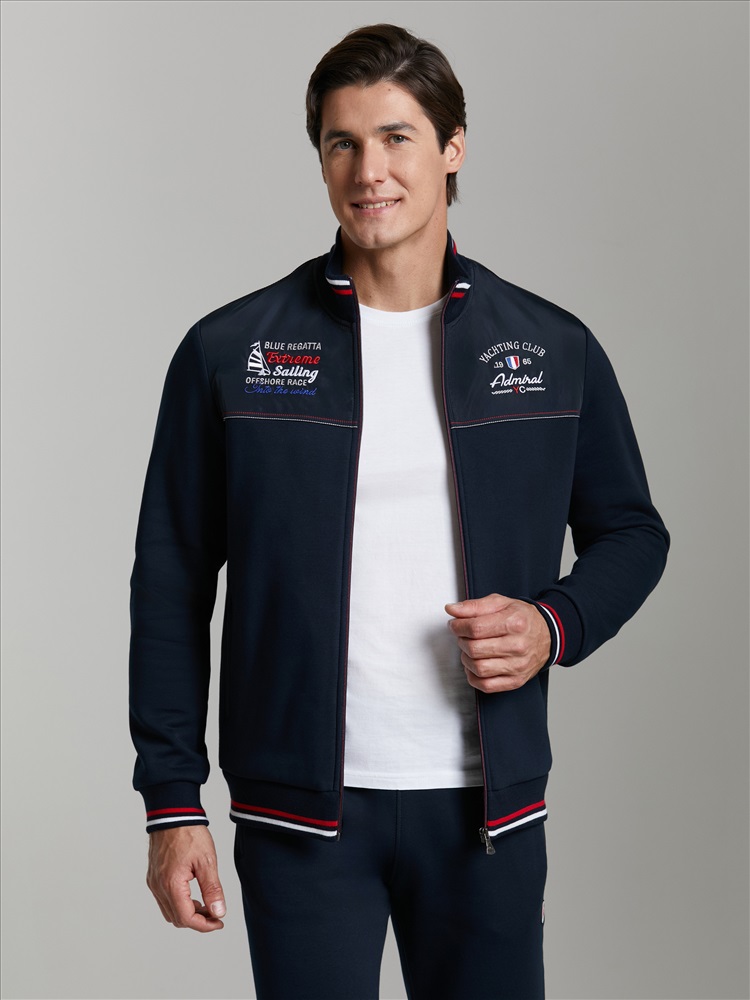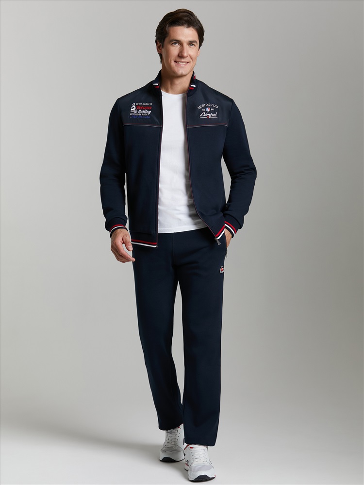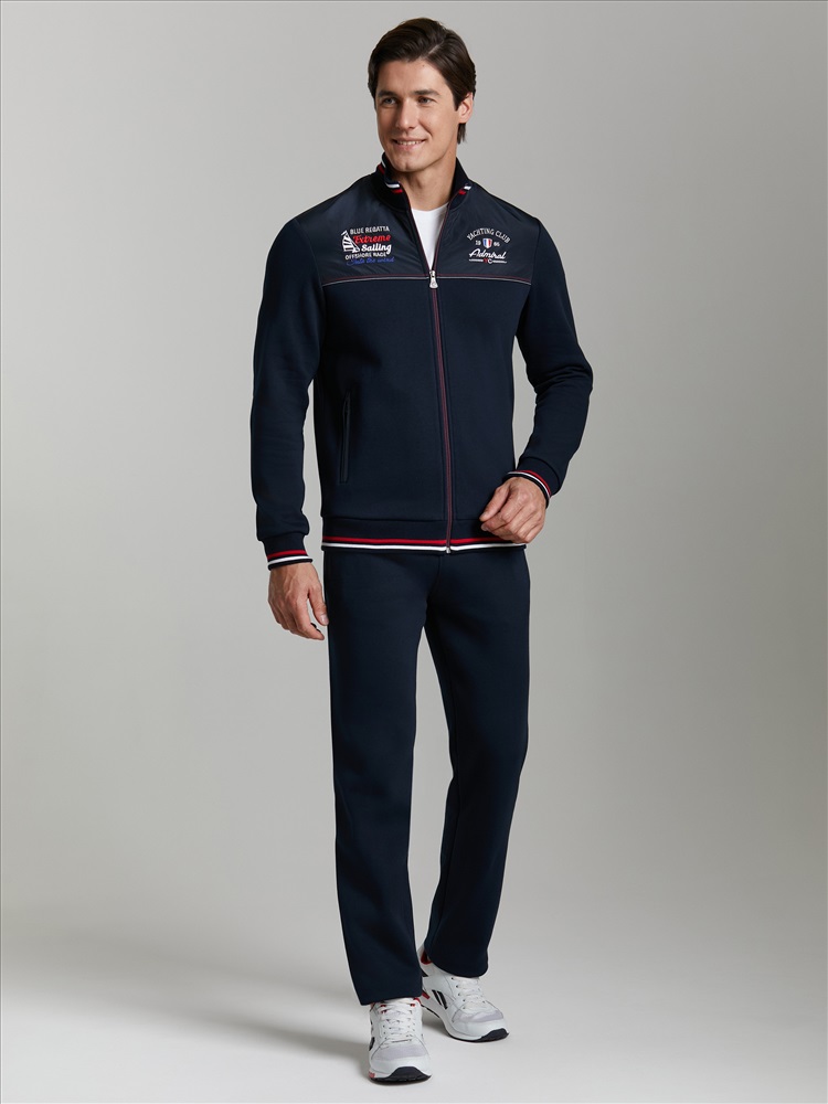 Состав ткани: 65% хлопок, 35% полиэстер Мужской артикул 12M-RR-1859 темно-синего цвета спортивный спортивный костюм из хлопкового трикотажного полотна с изнаночным начесом. Костюм выполнен в морской стилистике. Широкая кокетка куртки выполнена из водоотталкивающей плащевой ткани и отстрочена цветными нитями. Читать далее Яркие вышивки на кокетке, красные зубцы молнии и яркие полосы на подкладочных материалах пояса, манжет и воротника дополняют стильный дизайн изделия. Карманы куртки и брюк прорезные, застегиваются на молнии, выделены ярко-красными кантами. Брюки прямого силуэта, слегка заужены книзу. Под левым карманом брюк и на левом рукаве шеврон с фирменным логотипом. Пояс брюк по линии талии с эластичной резинкой, дополнительно регулируется шнуром. Комментарии к товару