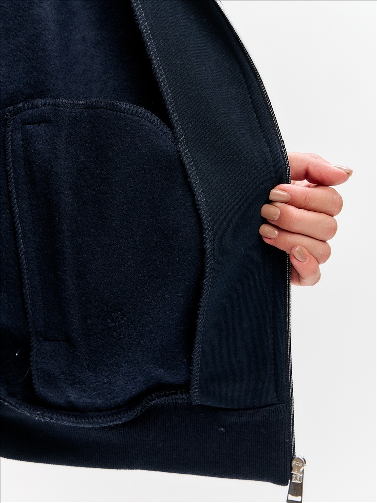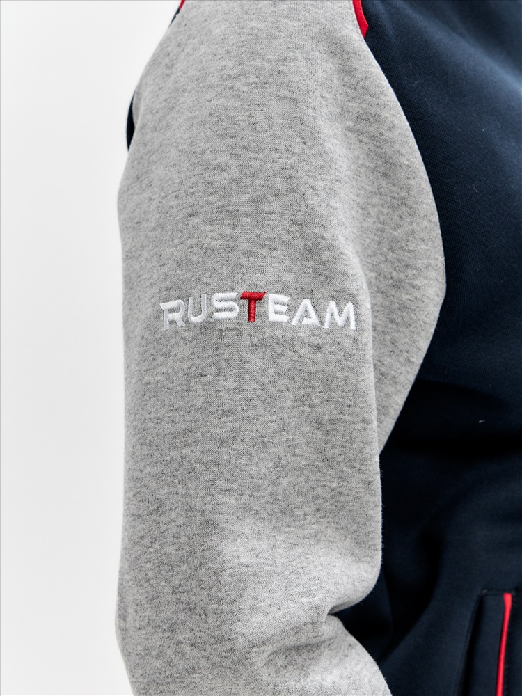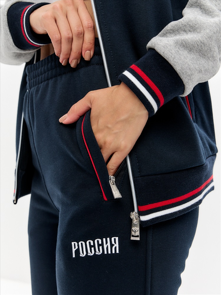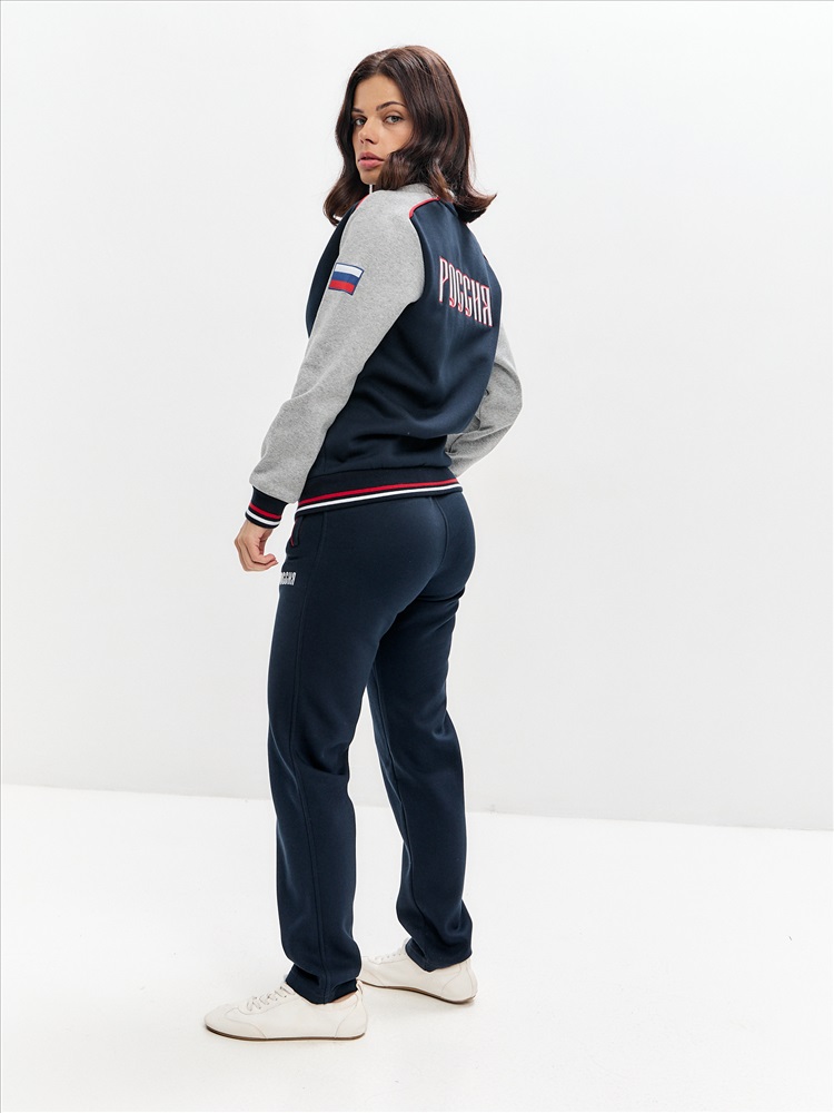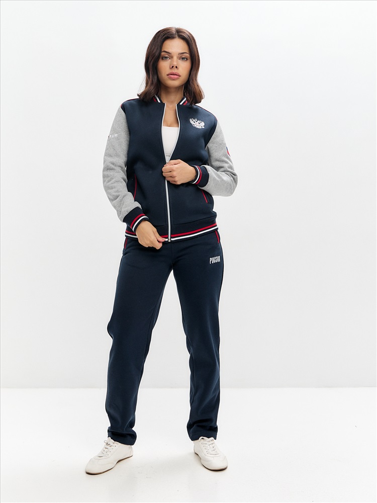 Женский артикул 12L-RT-1861 темно-синего цвета спортивный спортивный костюм из хлопкового трикотажного полотна с изнаночным начесом с элементами российской символики. Куртка костюма в стиле "бомбер" на поясе, с воротником-стойкой, застегивается на молнию. Рукава покроя реглан из серого меланжевого полотна. Перед и спинка куртки темно-синего цвета. По плечевой кокетке проложен красный кант. Изделие богато украшено вышивками. На левой груди вышивка герба России. На спинке вышивка Россия. На левом рукаве шеврон с российским флагом. Пояс, воротник и манжеты куртки изготовлены из темно-синего эластичного подкладочного материала с красными и белыми полосами. Карманы куртки и брюк прорезные, на молниях, выделены ярко-красными кантами. Брюки темно-синие, прямого силуэта, слегка заужены книзу. Под левым карманом брюк вышивка Россия. Пояс брюк по линии талии с эластичной резинкой, дополнительно регулируется шнуром.