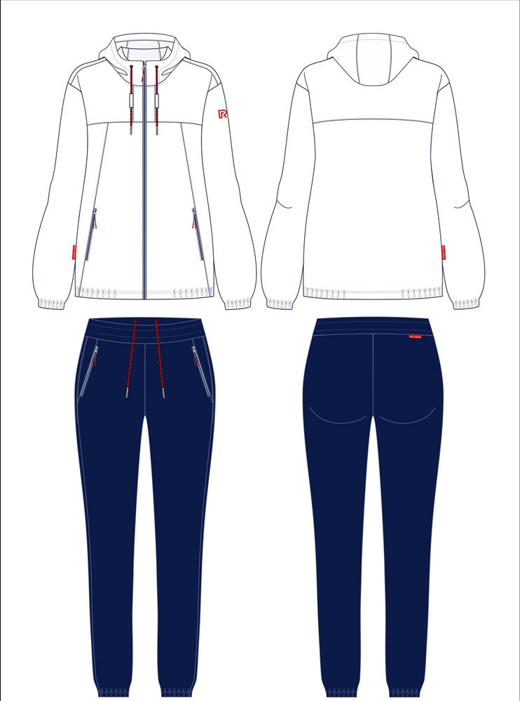 Костюм из легкой плащевой ткани с капюшоном на молнии. Куртка на сетчатой подкладке, силуэт куртки прямой, покрой рукавов - втачной. Спереди на куртке боковые вставки, в шве вставок - карманы. Ширина низа рукавов регулируется патой. Брюки легкие, без подкладки. Силуэт брюк зауженный. Карманы брюк - в боковых подрезах. Пояс брюк с эластичной резиной, по талии дополнительно регулируется шнуром.