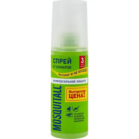 Спрей "Универсальная защита", 100 мл репеллент Спрей обладает отпугивающим эффектом против комаров, мошек, мокрецов и москитов. Средство можно наносить как на кожу, так и на одежду. - Продолжительность действия до 3 часов