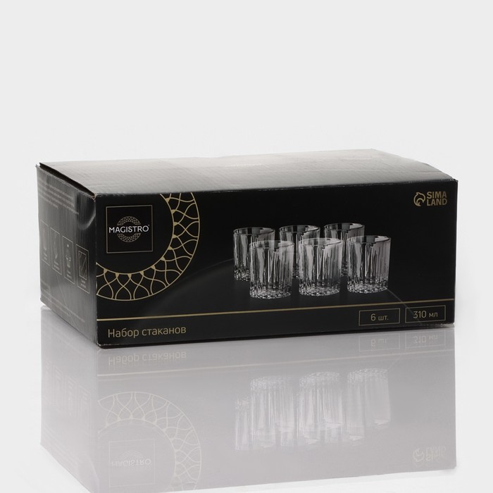 Производитель: Magistro; Габариты: 25 x 17 x 10; Страна: Китай; В боксе: 8 набор; Состав: Стекло; Материалы: стекло; Фасовка: по 1 набор; Индивидуальная упаковка: Картонная коробка; Сертификат: СТР; Набор: Да; Цвет: Прозрачный; В наборе, шт.: 6; Объём, мл: 310; Тематика: Однотонная; Вид упаковки: Коробка картонная; Рисунок: Нет; Назначение: Универсальные; Материал: Стекло; Для детей до 3 лет: Нет; Можно мыть в посудомоечной машине: Да; Можно использовать в СВЧ-печи: Нет; Текстура: С рельефом; Особенности: Без особенностей; Для горячего: Нет; Фиксированная цена: Да