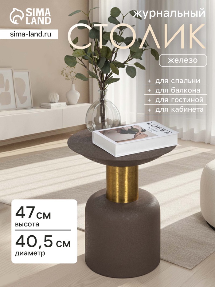 Невысокий круглый столик из металла в насыщенном коричневом оттенке «Какао с золотом». Его компактные размеры и стабильная форма делают его идеальным спутником для дивана или кресла, создавая удобную поверхность для чашки кофе, книги или пульта.