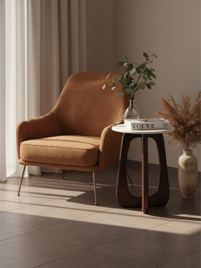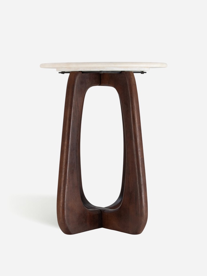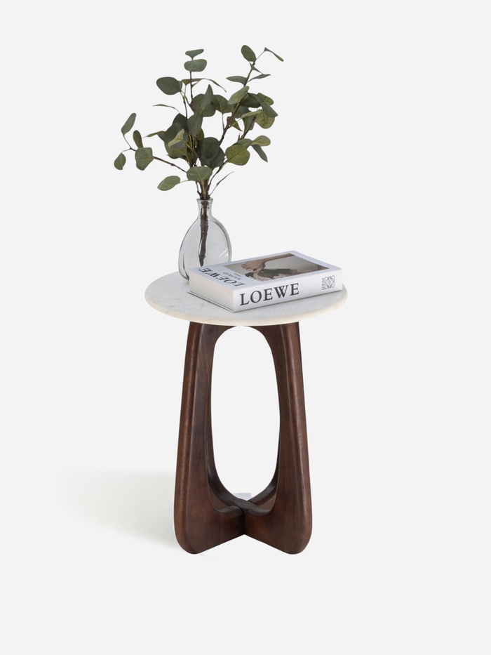 Круглый журнальный столик из дерева и белого мрамора. Сочетание тёплой коричневой деревянной основы и светлой каменной столешницы создаёт в интерьере мягкий, гармоничный акцент, объединяющий природные текстуры в сбалансированную композицию.