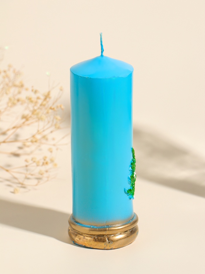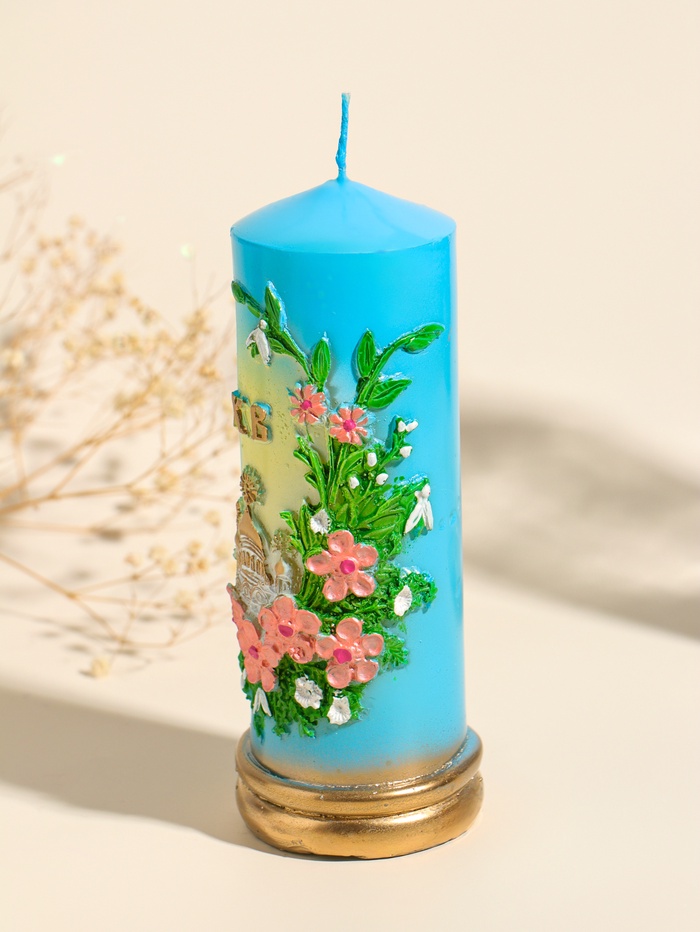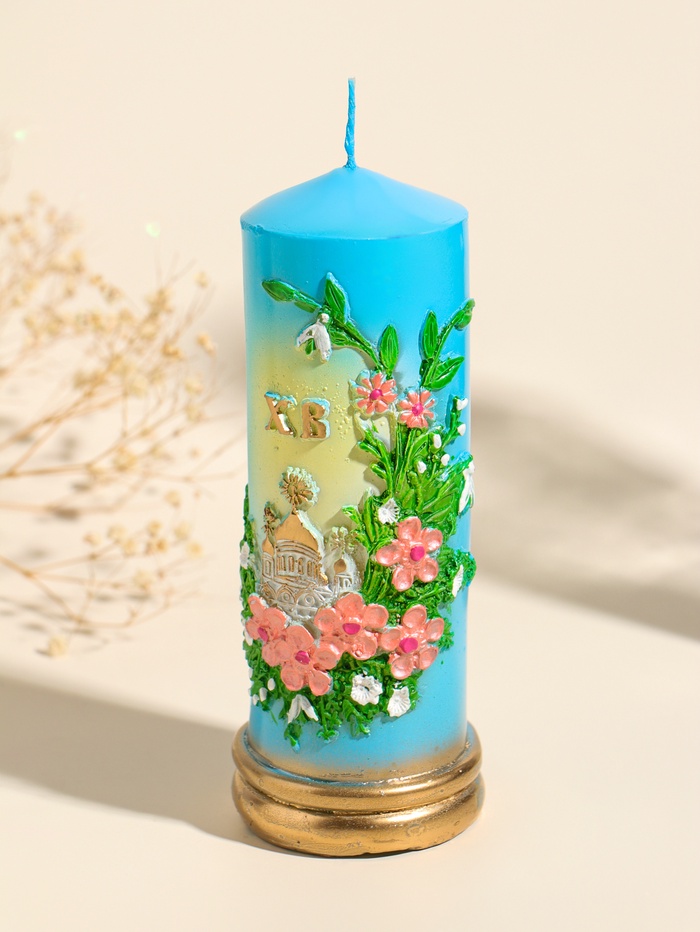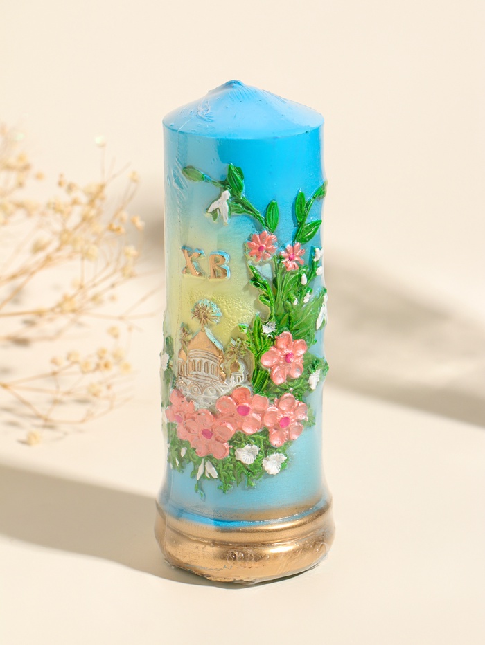Голубая пасхальная свеча в виде столбика создаст в доме атмосферу светлого праздника. Её чистый, спокойный цвет напоминает о весеннем небе и символизирует надежду. Классическая цилиндрическая форма и ровное горение делают эту свечу универсальным элементом пасхального декора — она гармонично дополнит и праздничный стол, и домашний иконостас.