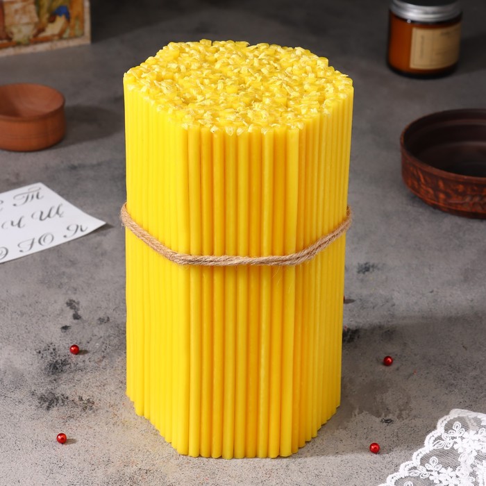 Габариты: 11,5 x 13,5 x 21; Страна: Россия; В боксе: 10 набор; Состав: Высокоочищенный пищевой парафин 100%; Материалы: высокоочищенный пищевой парафин; Фасовка: по 1 набор; Индивидуальная упаковка: Без упаковки; Сертификат: Не подлежит сертификации; Набор: Да; Цвет: Жёлтый; Высота, см: 20; Время горения, ч: 1; Вес, кг: 2; Высота свечи, см: 20,5; В наборе, шт.: 300; Тематика праздника: Крещение, Пасха; Форма свечи: Цилиндр; Ароматизированные: Нет; Ручная работа: Да; Темпер. ограничение НЕ НИЖЕ ℃: -10; Темпер. ограничение НЕ ВЫШЕ ℃: +25; Номер: 60; Состав: Парафин