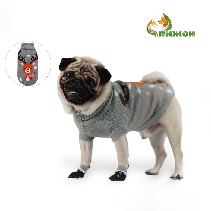 Свитер "Олень на сером" для собак имеет уникальный новогодний дизайн, который придаст вашему питомцу особый вид во время праздников.