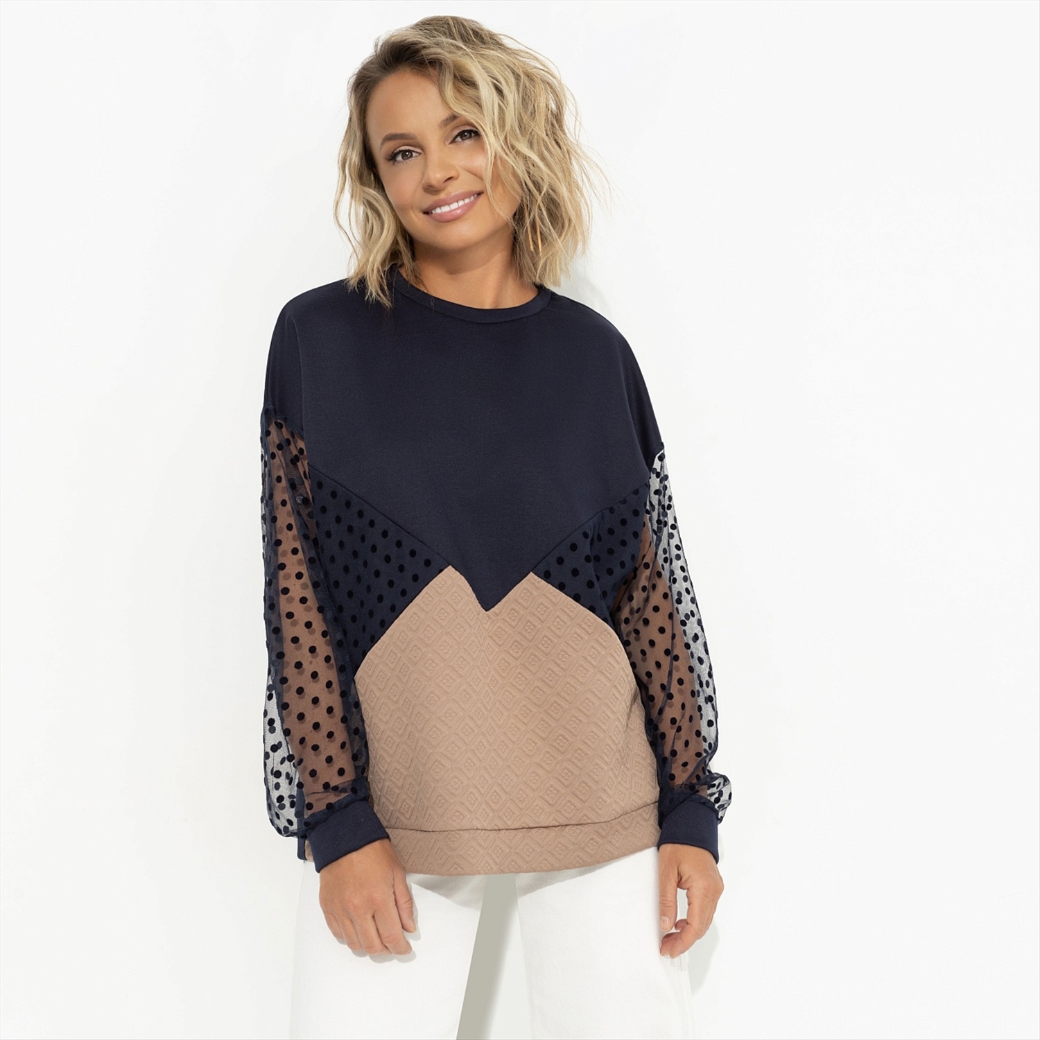 Черничный пирог, в котором очень тонкий слой теста и щедрый объем свежей ягоды. Так мы видим свитшот CHARUTTI в сочетании бежевого и чернично-синего. Лакомый кусочек, что сказать. Свитшот в комбинации нескольких видов ткани. Материал основной части изделия текстурный. Рукава оформлен тонким кружевом. Посадка свитшота свободная. Подойдет любому типу фигуры. Свитшот оверсайз «Любимый образ (шоколадный мусс)» от CHARUTTI — это не просто элемент гардероба, а настоящее произведение искусства, созданное для тех, кто ценит комфорт и стиль. Вдохновленный черничным пирогом, где нежное тесто поддерживает щедрую порцию свежих ягод, этот женский свитшот сочетает в себе бежевые и чернично-синие оттенки, которые привносят в ваш образ нотку утонченной элегантности. Свободная посадка делает его идеальным выбором для любого типа фигуры, обеспечивая свободу движений и комфорт в течение всего дня. Представьте, как приятно будет носить этот свитшот оверсайз, окутывающий мягкой текстурой тканей — трикотаж «лакоста», трикотаж «жаккард» и «сетка трикотаж». Свитшоты женские оверсайз — это не просто тренд, а настоящая находка для тех, кто хочет выглядеть стильно и чувствовать себя уютно в любое время года. Комбинация нескольких видов тканей не только подчеркивает ваши достоинства, но и добавляет оригинальности вашему образу. Тонкое кружево на рукавах придает изделию изысканность и женственность, а текстурная основная часть создает эффектный контраст. Этот женский свитшот больших размеров — идеальный выбор для оптовых закупок, так как он подойдет как для повседневной носки, так и для особых случаев, подчеркивая вашу индивидуальность и чувство стиля. Покупая свитшот оверсайз женский оптом, вы не только получаете высококачественный продукт, но и возможность порадовать своих клиентов уникальным и востребованным товаром. Свитшот женский теплый «Любимый образ (шоколадный мусс)» станет отличным дополнением к любому гардеробу, привнося уют в прохладные дни и поднимая настроение своим утонченным видом. Этот свитшот женский — идеальное сочетание комфорта, стиля и практичности, которое непременно оценят ваши клиенты. Поэтому не упустите возможность приобрести его оптом и подарить своим покупателям истинное удовольствие от носки. Комментарии к товару