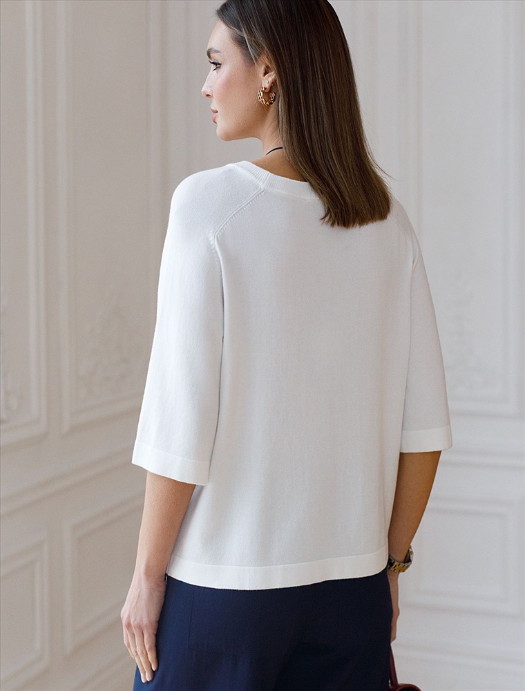 Легкий свободный джемпер белого цвета с круглым вырезом идеально подходит на весну и лето. Тонкая вязка из вискозы дарит приятный комфорт и ощущение свежести в теплую погоду. Универсальная длина позволяет сочетать джемпер с разными элементами гардероба. Джемпер отлично смотрится на больших размерах благодаря продуманному крою и свободному фасону. Широкие рукава создают воздушность и делают силуэт особенно женственным. Этот джемпер с рукавом 3/4 станет незаменимой частью гардероба в сезоны, когда хочется легкости и элегантности одновременно. Лаконичный дизайн обеспечивает простоту комбинирования с другими вещами и будет универсальной базой для создания разнообразных комплектов — от офисного до непринужденного городского стиля.