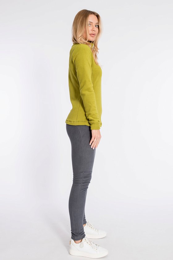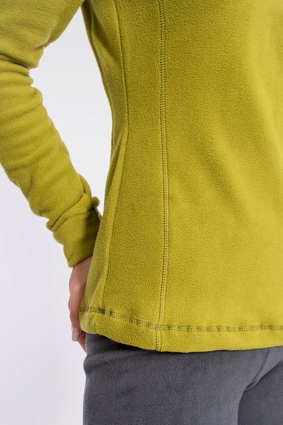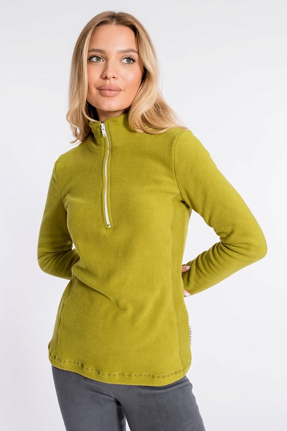 Толстовка из флиса с воротником-стойкой, втачными рукавами и короткой застежкой на молнию. Спереди и на спинке декоративная отстрочка по швам соединения деталей изделия.
