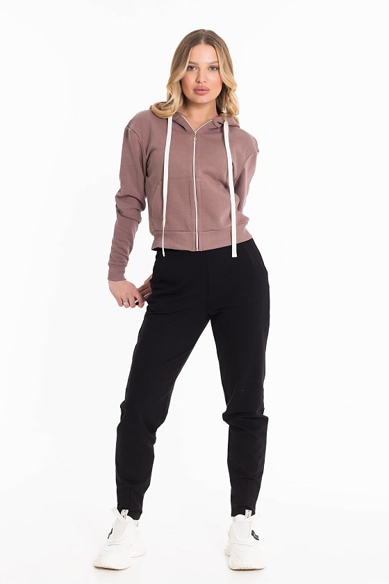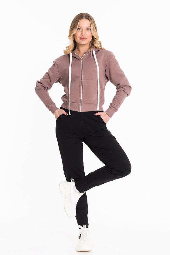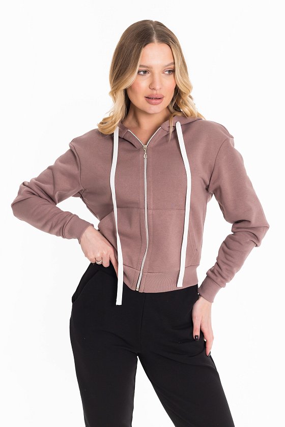 Толстовка выполнена из футера трёхнитки (воздушка). Капюшон со шнуром, манжеты рукавов и пояс изделия из кашкорсе. Спереди карманы.