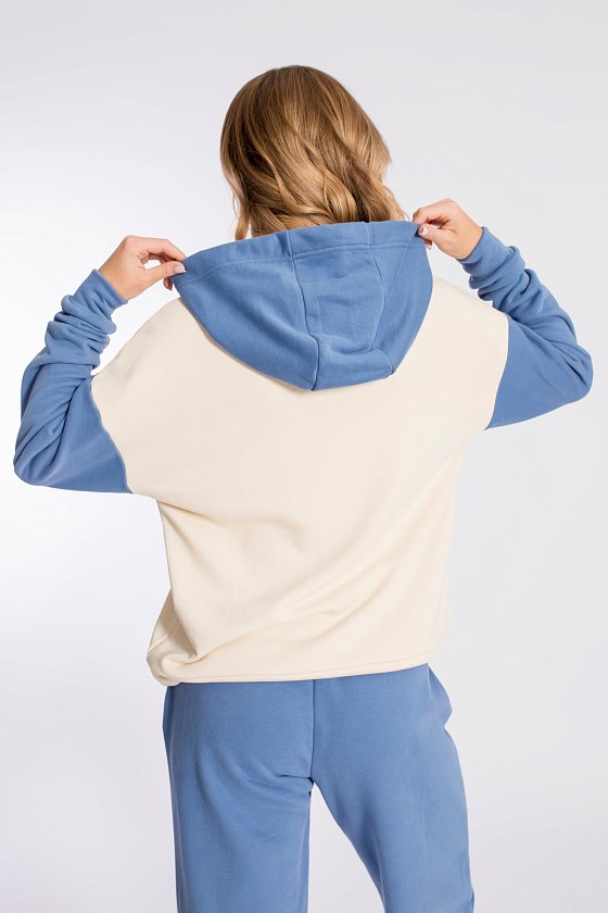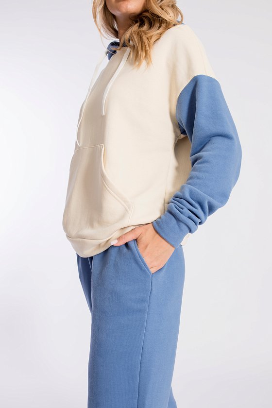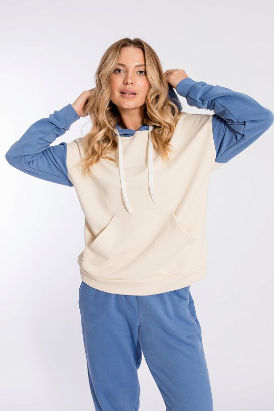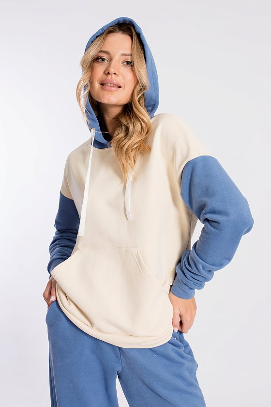 Женская толстовка выполнена из полотна футер трёхнитка (воздушка). Силуэт толстовки свободный, ширина капюшона регулируется шнуром. Линия плеча спущена, длинные рукава заканчиваются манжетами. Спереди располагается карман-кенгуру.