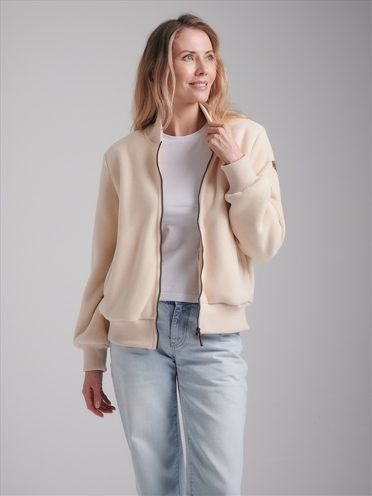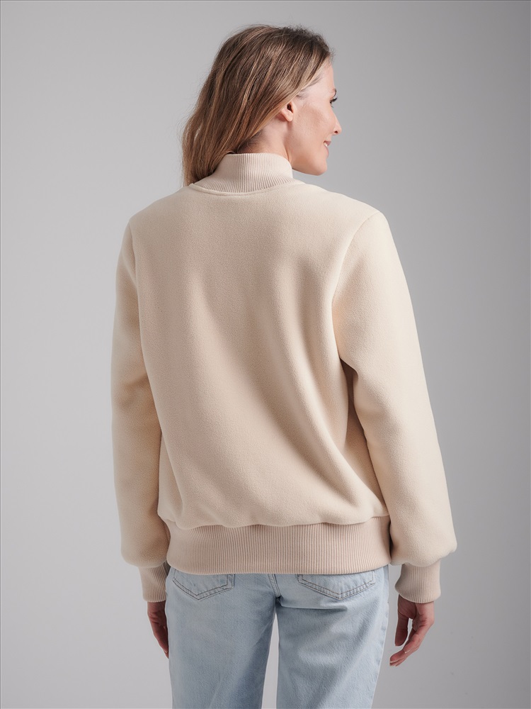 Толстовка-бомбер женская из плотного флиса, дублированного мехом. Застегивается на молнию. Воротник - стойка из эластичного трикотажа. Низ куртки заужен трикотажным поясом. Рукава втачные, низы рукавов на трикотажном манжете. Карманы прорезные, с молниями На левом рукаве шеврон с фирменным логотипом.