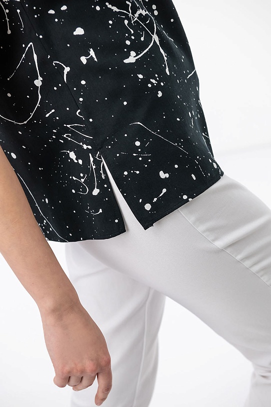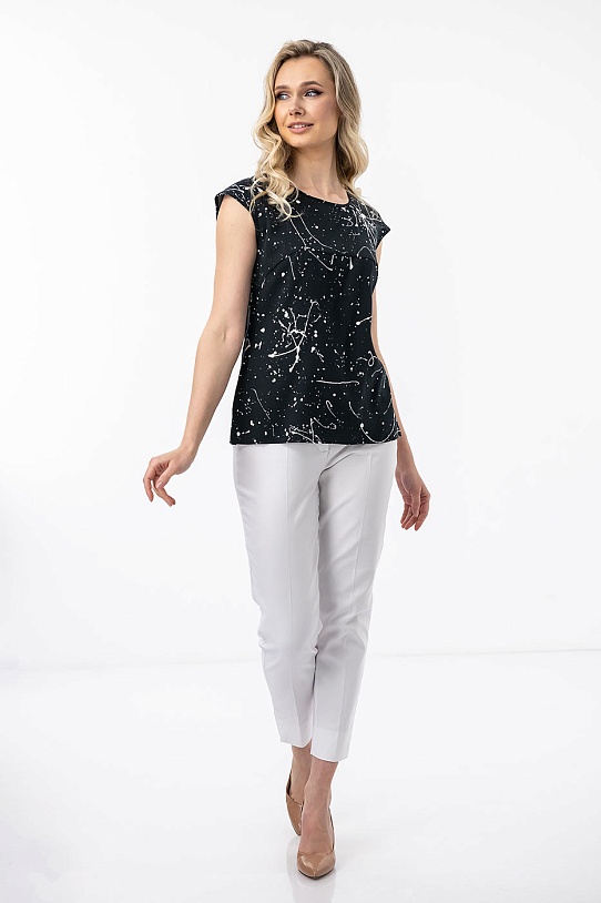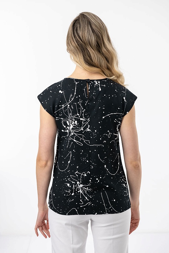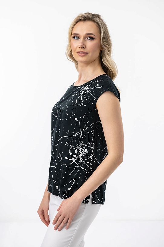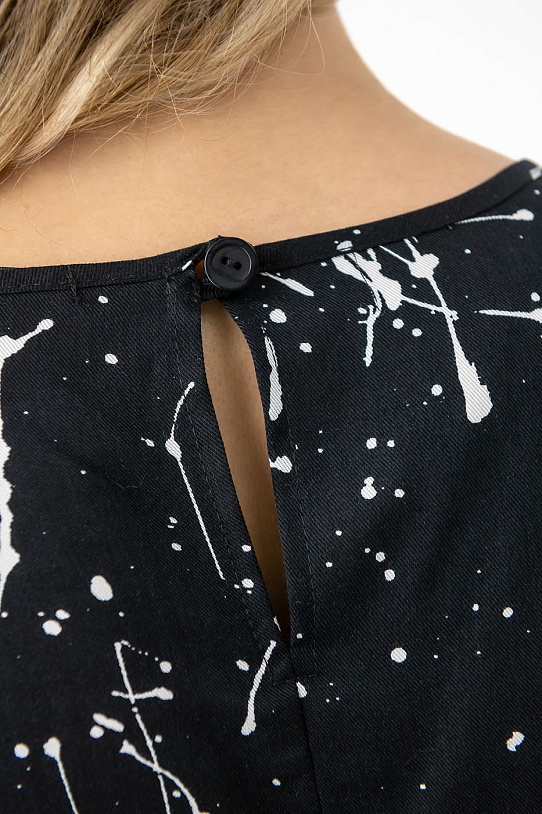 описаниеЛетний топ со спущенным плечом, прямого силуэта. Круглый вырез, подрез выше линии груди. Застежка по спинке на пуговицу. По боковым швам небольшие разрезы.