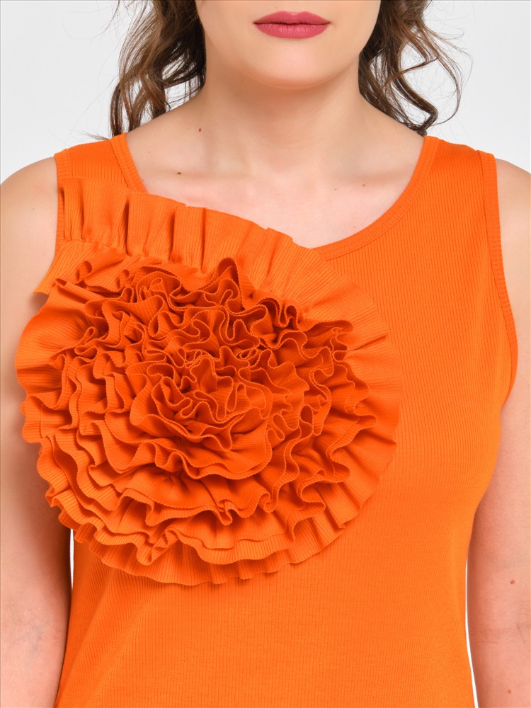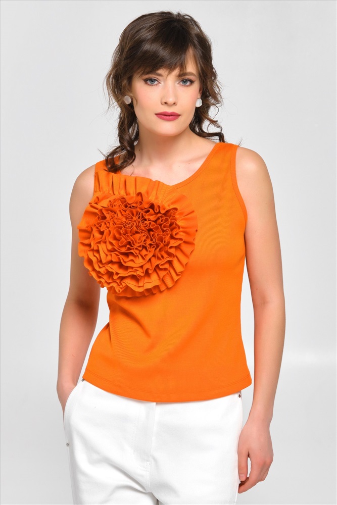 Топ с декоративным цветком от фабрики Priz., Модель прилегающего силуэта, выполнена из трикотажного полотна морковного цвета. Вырез горловины округлый. Г, орловина и пройма оконтованы., Комфорт и стиль на каждый день., Оттенок цвета может незначительно отличаться от фото., Ожидание отправки (рабочих дней): 7, Размер модели: 44., Рост модели: 180 см., Состав:, Вискоза 50%, Полиэстер 47%, Эластан 3%, Тип ткани:, Трикотаж