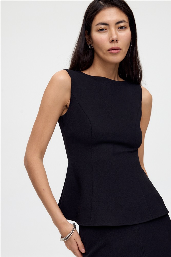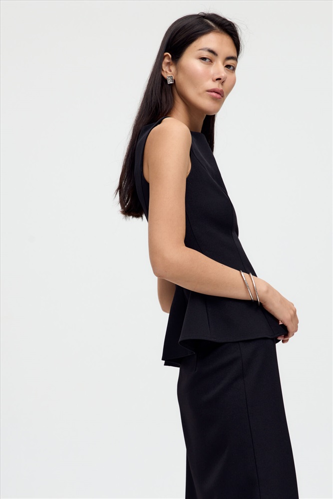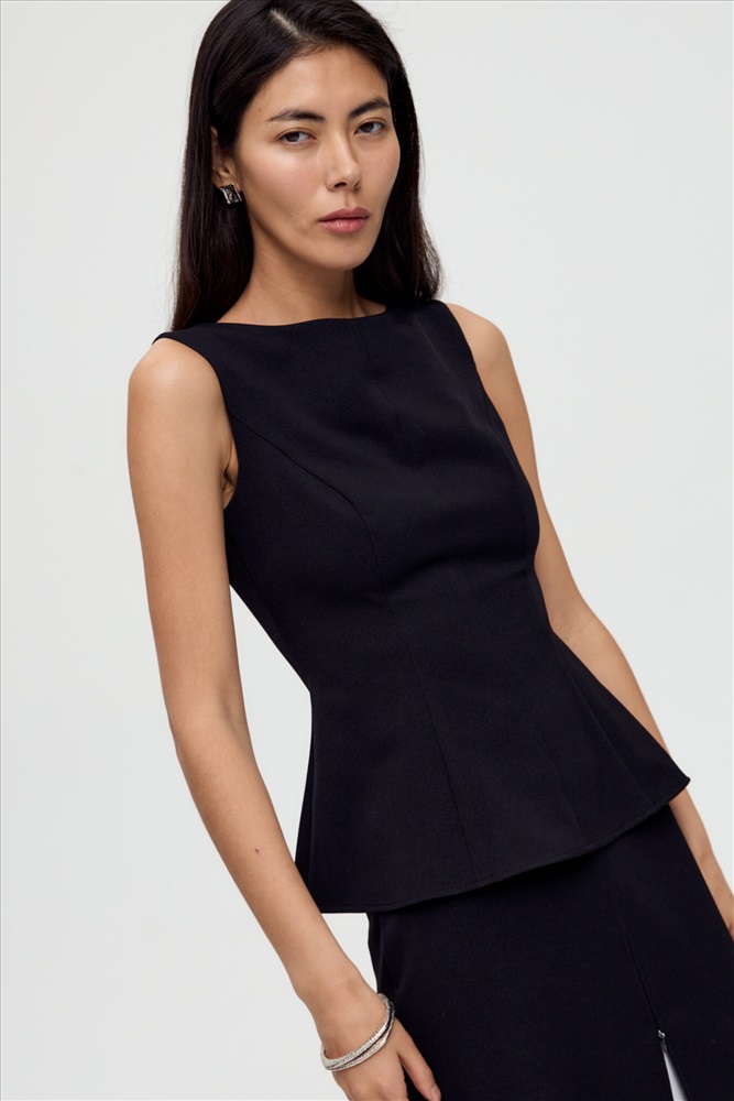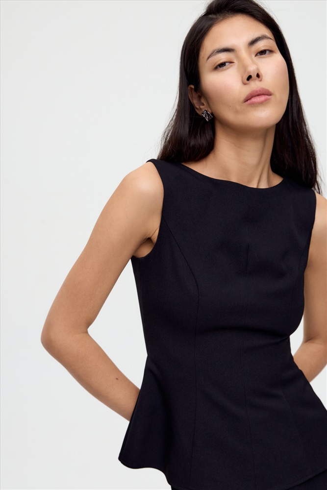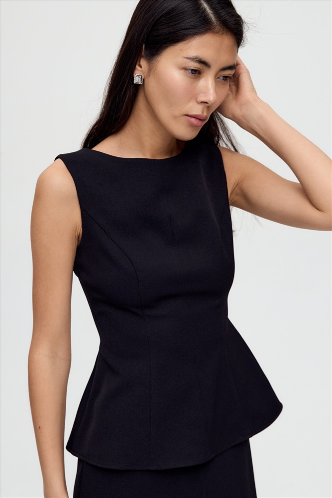 Блуза с баской из плотного костюмного полотна. Модель полуприлегающего силуэта. По переду рельефы, формирующие утонченный силуэт. По спинке рельефы и застежка на потайную молнию.