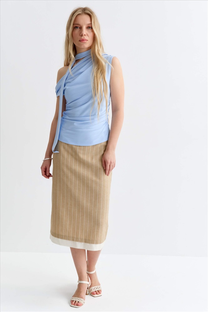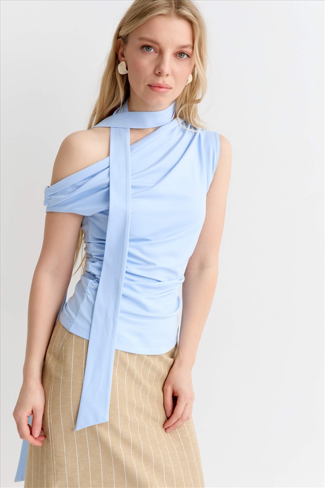 Состав: 95% вискоза 5% эластан Длина: 60 см. (42 размер), 63 см. (52 размер) Цветовая гамма: Голубой Силуэт: Прилегающий Принт: Нет Коллекция: Весна #2 Асимметричный топ из вискозного трикотажа. Модель прилегающего силуэта с асимметричной линией плеча. По линии талии сборки. Горловина на широкой обтачке по переду и спинке.В комплекте шарф из основного материала. Комментарии к товару