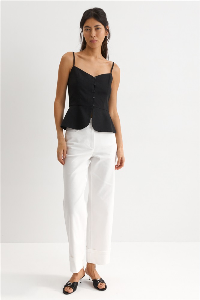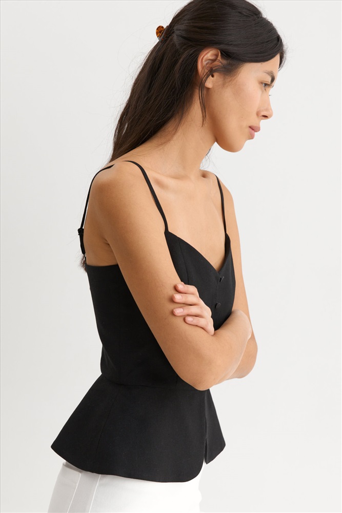 Состав: 70% Лен 30% Вискоза Длина: 55 см (42 размер), 57 см (48 размер) Цветовая гамма: Черный Силуэт: Прилегающий Принт: Нет Коллекция: Лето #4 Элегантный топ из льняного полотна. Модель прилегающего силуэта. Отрезная линия талии с баской. По переду и спинке рельефные швы. Застежка на воздушные петли и пуговицы. Тонкие регулируемые бретели. Комментарии к товару