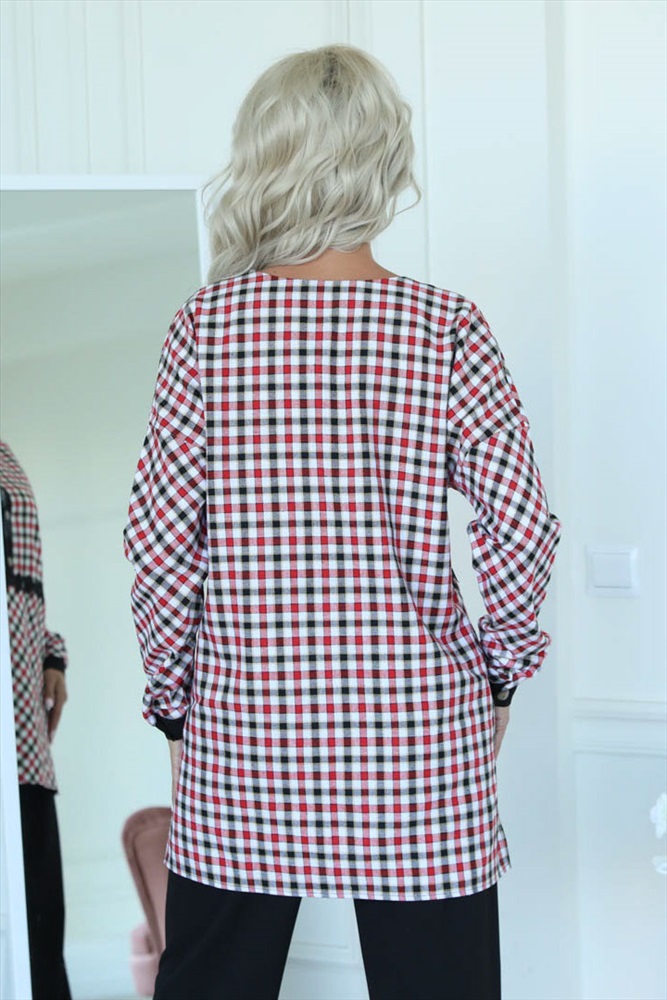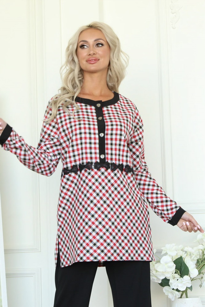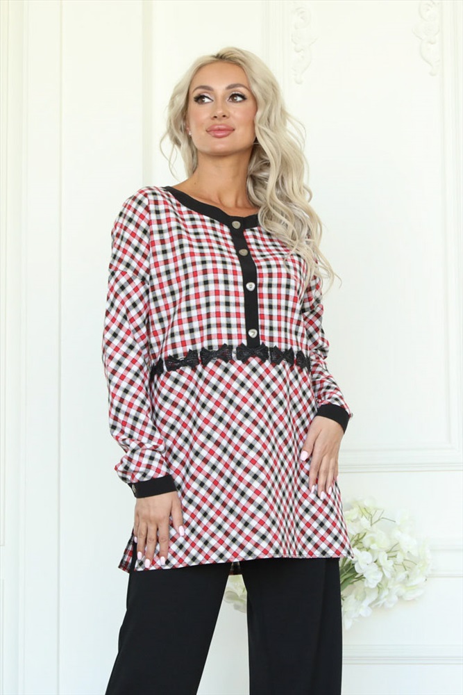 ШтрихКод: 4630328704463 По размеру: 44, 46, 50 Состав: Хлопок 100% Скидка на сайте: 50% Срок готовности: 2017-03-28T00-00-00 Милая туника прямого силуэта из текстильного полотна в клетку красного цвета. Спереди изделие отрезное по линии талии и украшено кружевной тесьмой черного цвета. Круглый вырез туники обработан широким контрастным кантом и дополнен планкой с застежкой на пуговицы. Втачной рукав со спущенной линией проймы понизу обработан манжетом контрастного черного цвета с застежкой на пуговицу. По боковым швам блуза дополнена разрезами. Аксессуары в комплект не входят. Длина изделия по спинке от плечевого шва до низа изделия — 78 см. Комментарии к товару