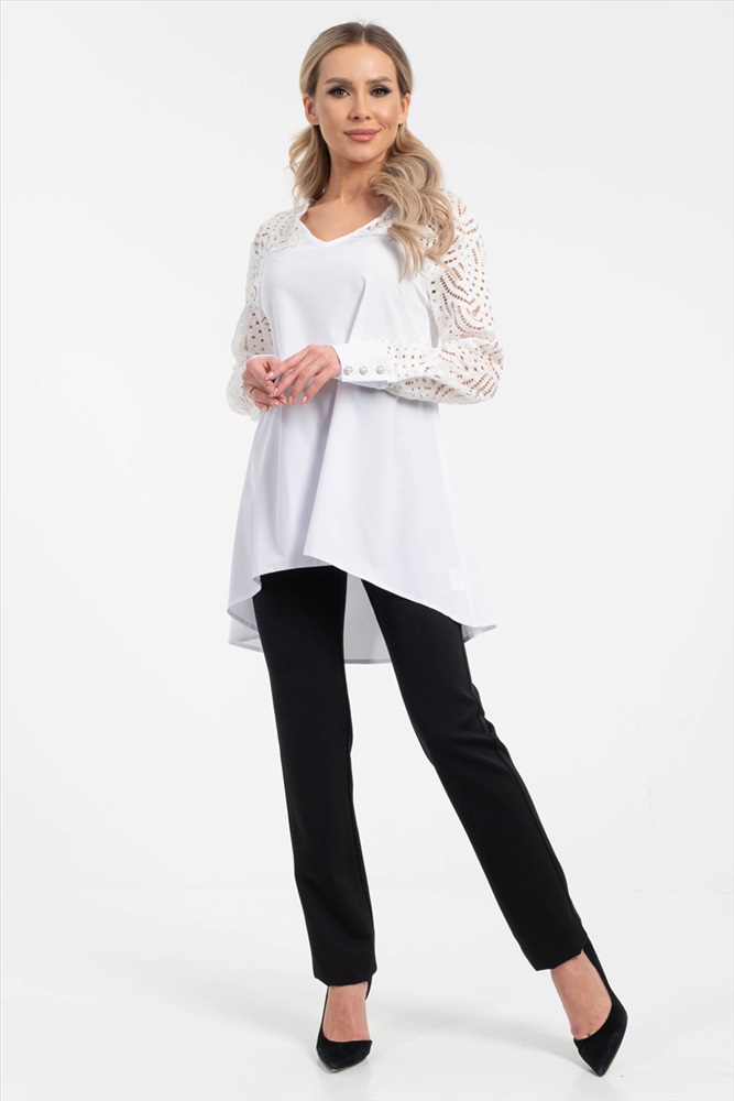Великолепная туника свободного силуэта из текстильного полотна белого цвета. V-образный вырез изделия обработан бейкой. Втачные рукава выполнены из кружевного полотна. Низ рукавов обработаны широкими манжетами с застежкой на пуговицы. Туника ресклешенная к низу.