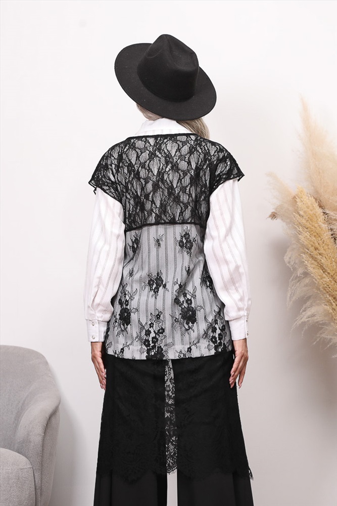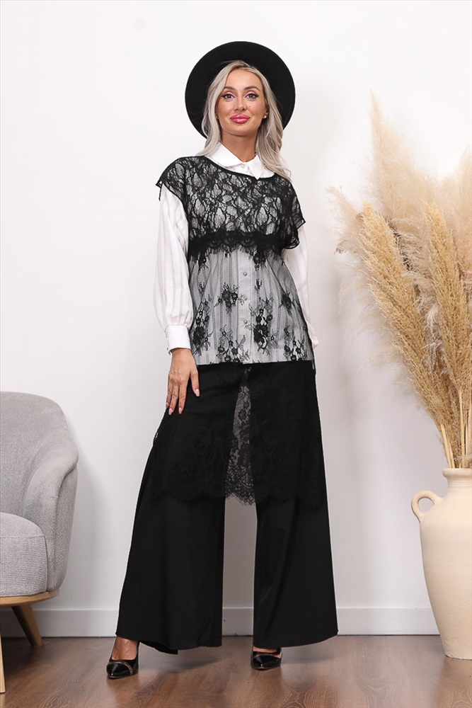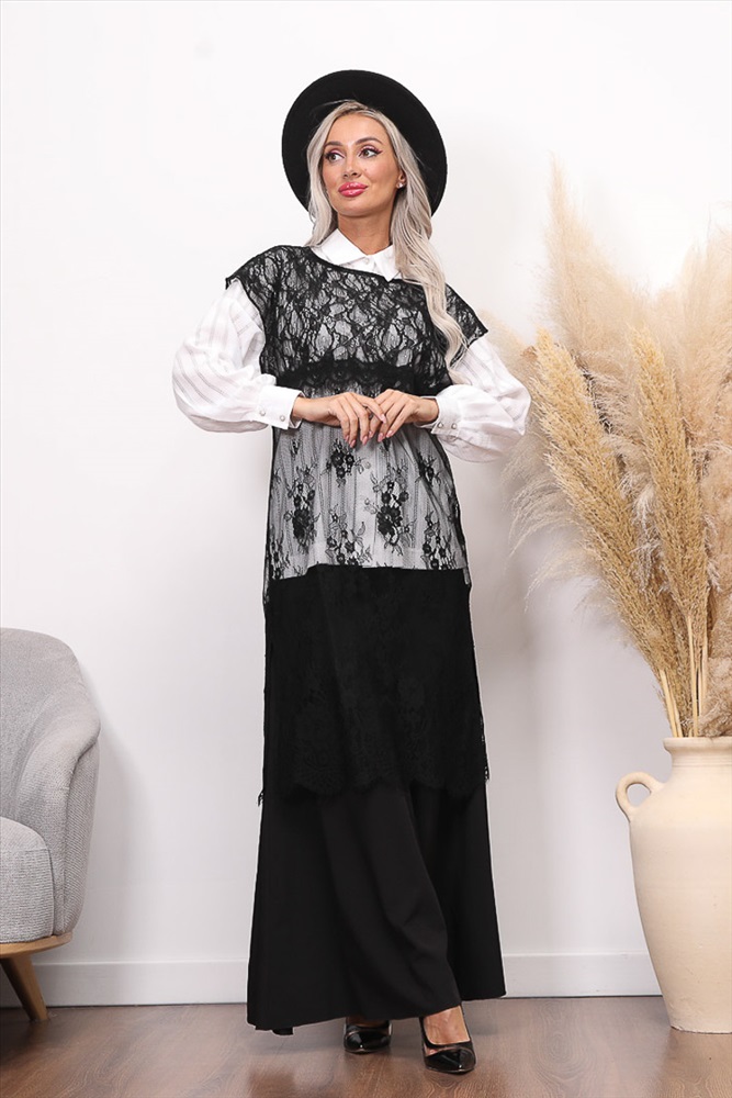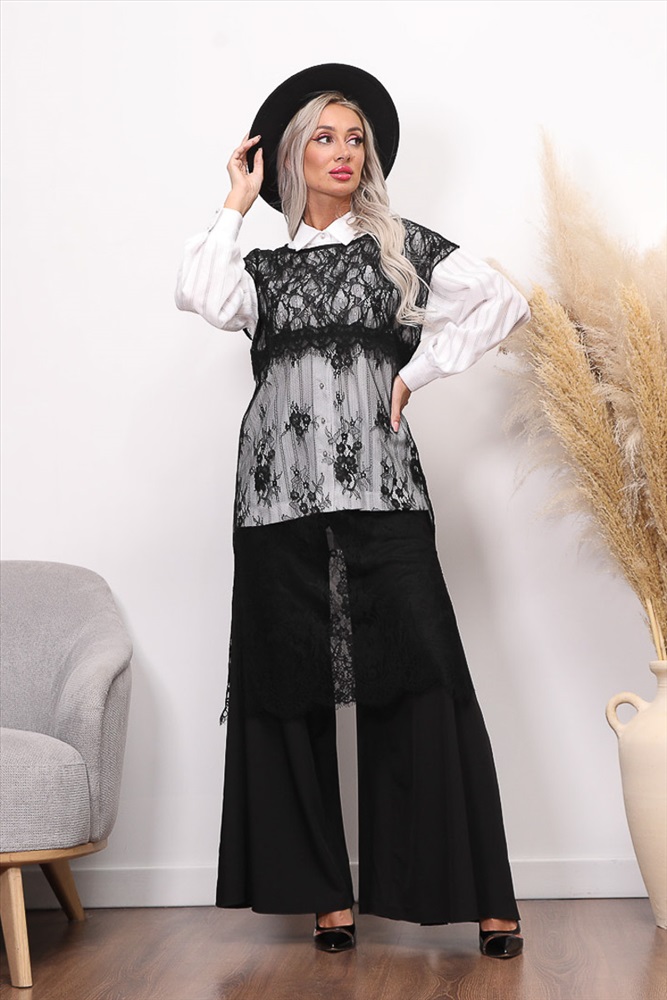 Роскошная туника прямого силуэта из тонкого кружевного полотна черного цвета. Круглый вырез и проймы изделия обработаны внутренней окантовкой. В боковых швах туники — разрезы.