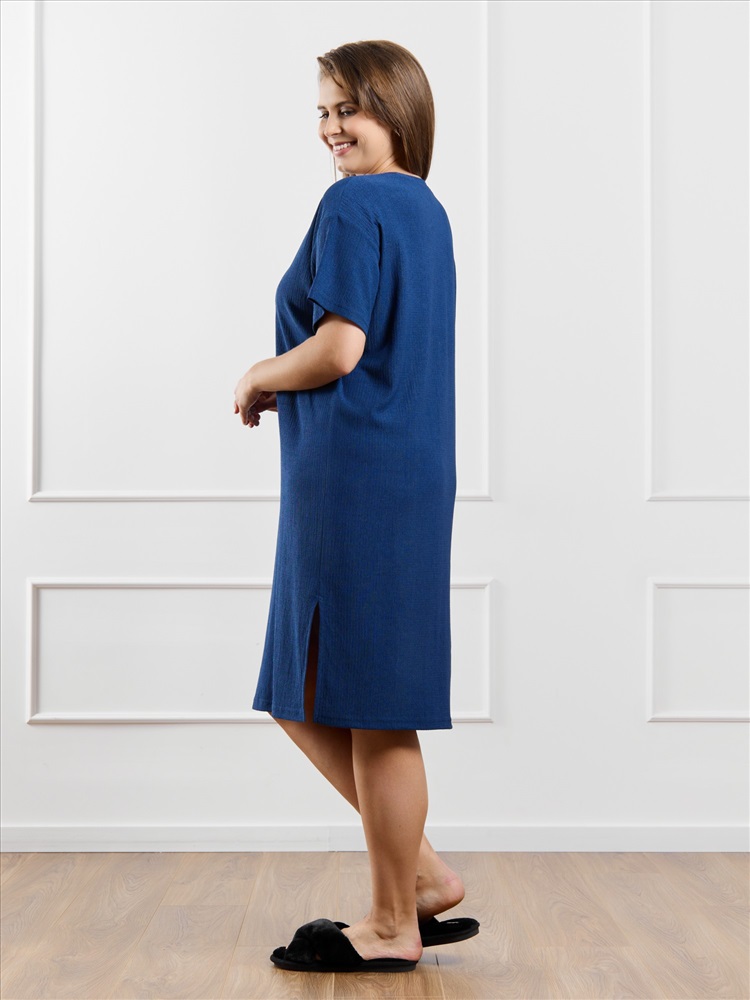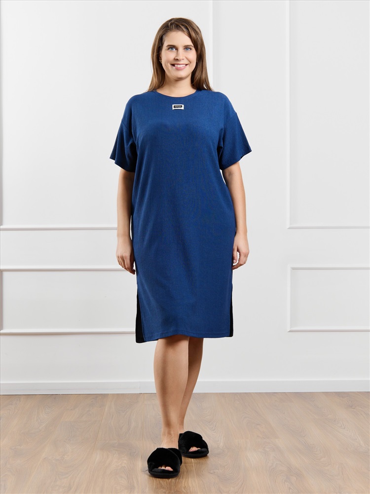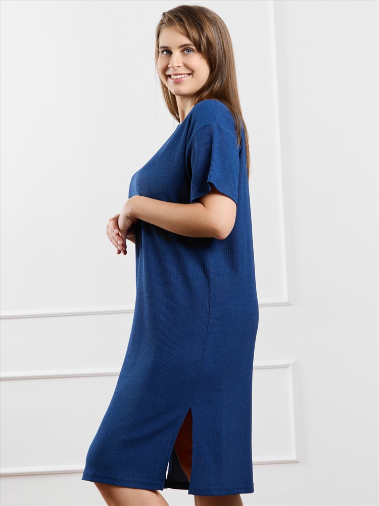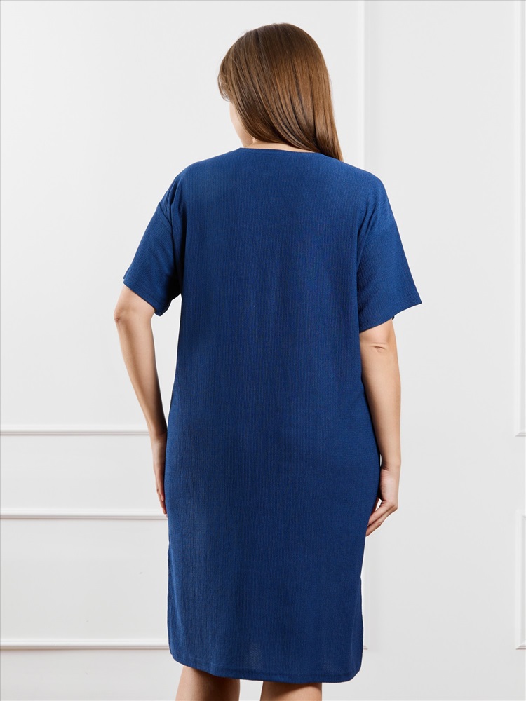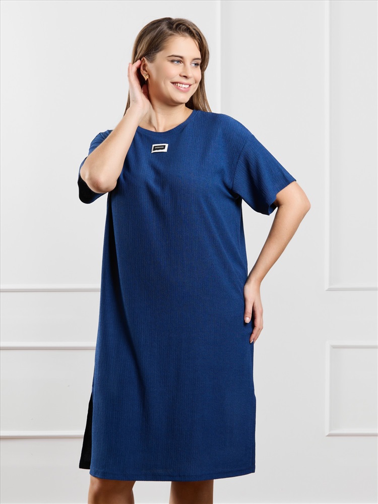 Туника женская из гладкокрашенного трикотажного полотна «бурумчук», прямого силуэта, с короткими втачными рукавами, горловиной овальной формы, обработанной втачной планкой, с разрезами в боковых швах. По центру полочки ниже горловины - настрочен декоративный элемент-нашивка.