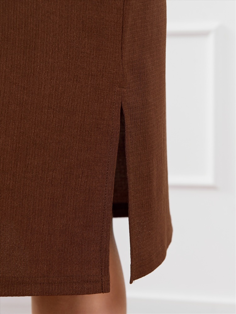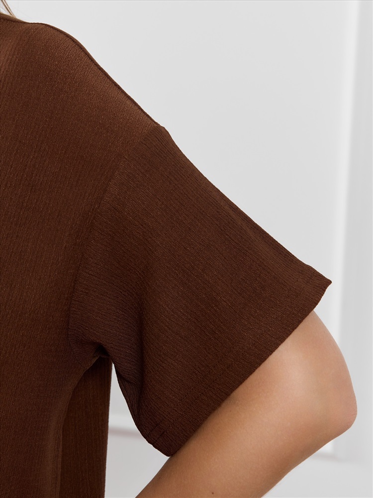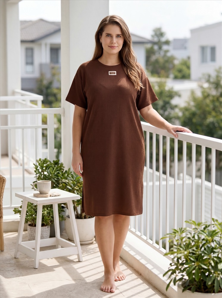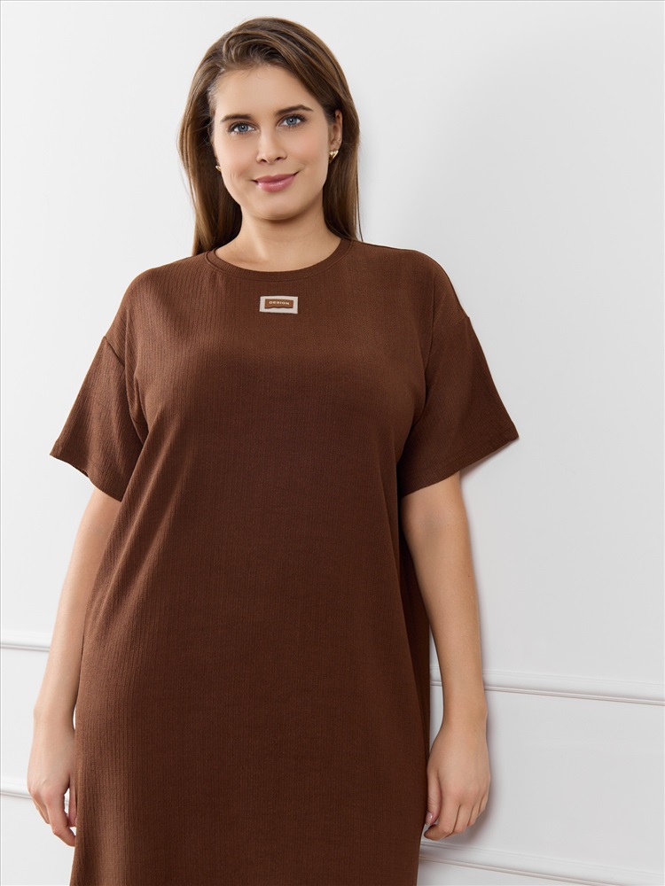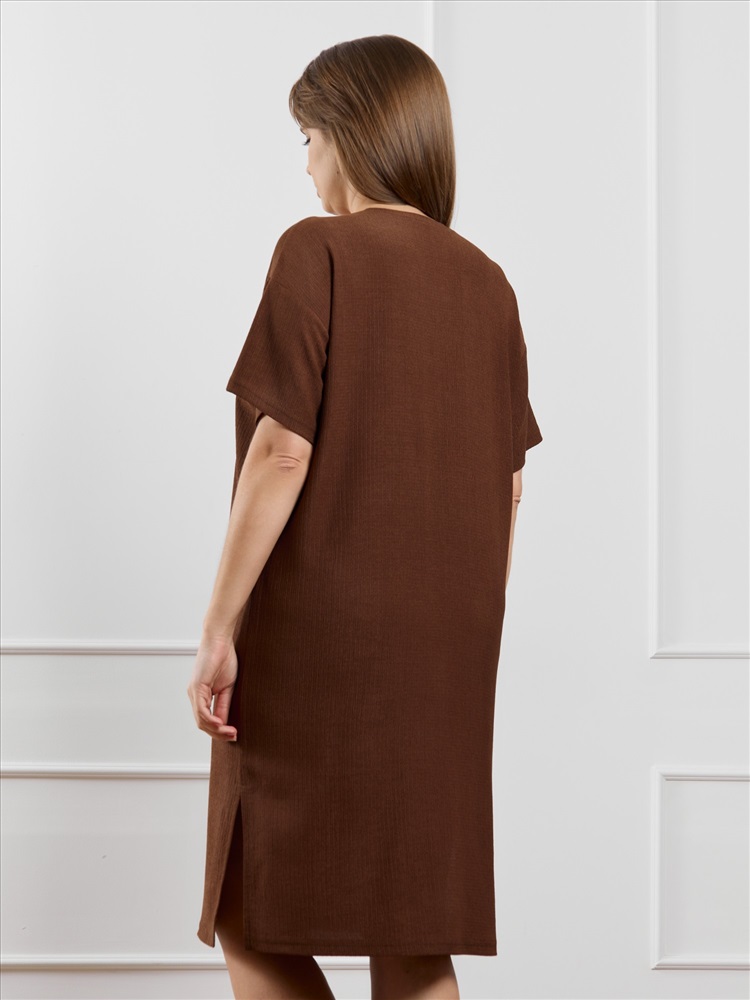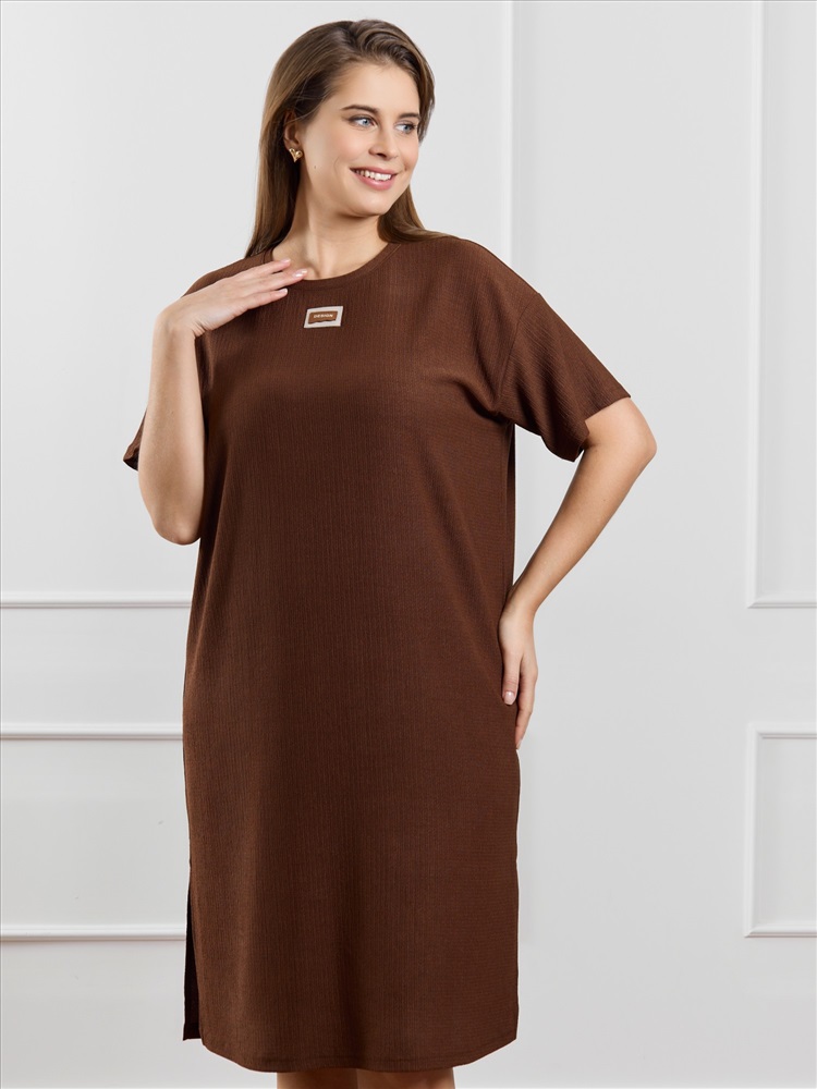 Ткань: Фактурный трикотаж Туника женская из гладкокрашенного трикотажного полотна «бурумчук», прямого силуэта, с короткими втачными рукавами, горловиной овальной формы, обработанной втачной планкой, с разрезами в боковых швах. По центру полочки ниже горловины - настрочен декоративный элемент-нашивка.