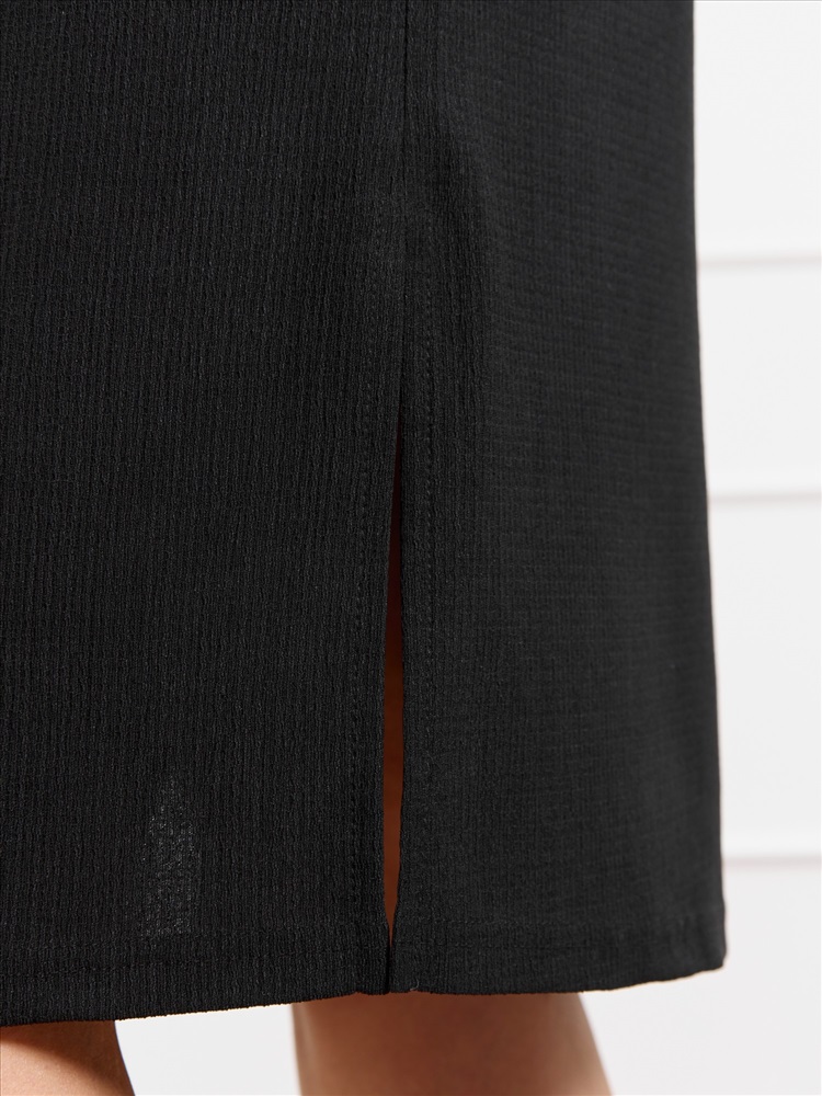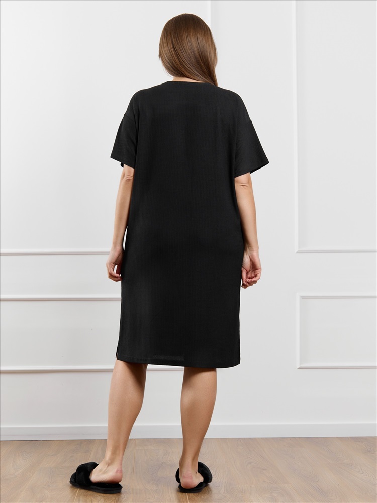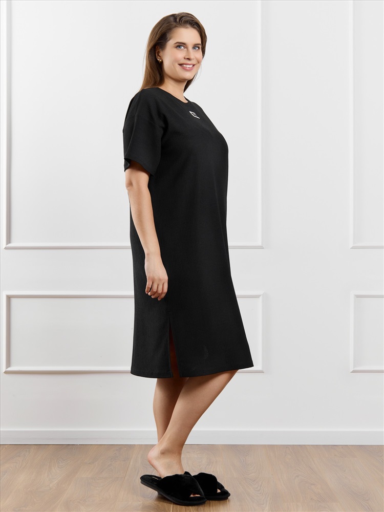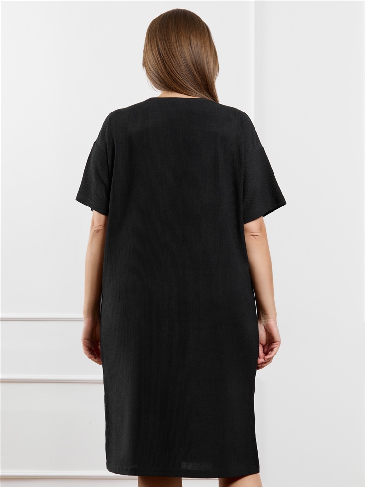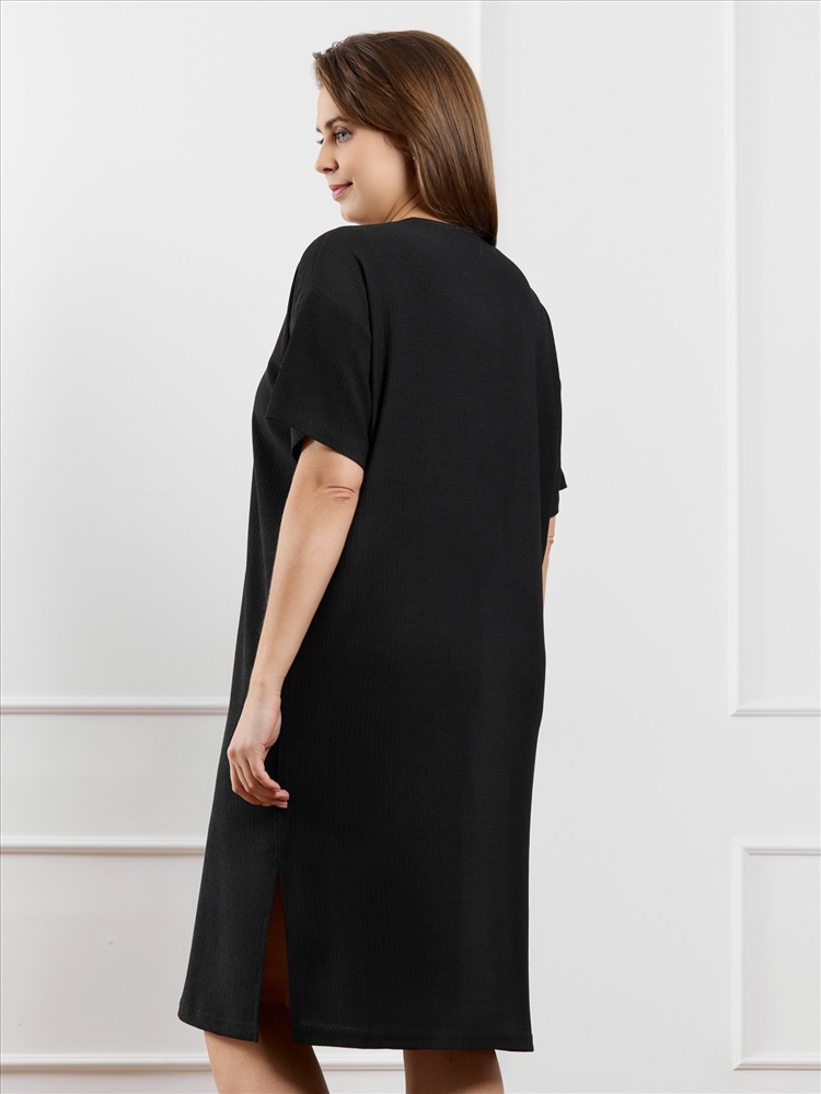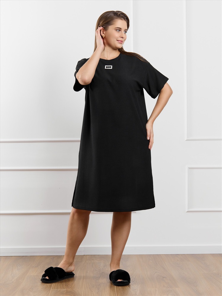 Ткань: Фактурный трикотаж Туника женская из гладкокрашенного трикотажного полотна «бурумчук», прямого силуэта, с короткими втачными рукавами, горловиной овальной формы, обработанной втачной планкой, с разрезами в боковых швах. По центру полочки ниже горловины - настрочен декоративный элемент-нашивка.
