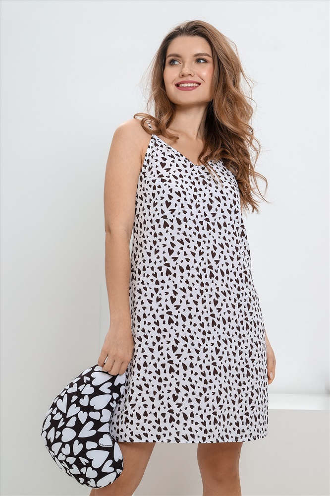 Ткань: Штапель Сорочка молодежная из тканого штапельного полотна с набивным рисунком, свободного покроя, слегка расширенная книзу, на узких бретелях. На полочках – вытачки в области груди. Вырез горловины и проймы окантованы основным материалом. Для регулирования бретелей по длине предусмотрены пластмассовые пряжки и кольца – держатели, устанавливаемые на бретелях.