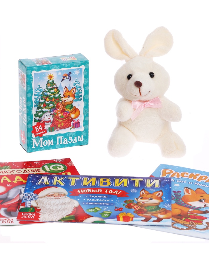 Подарочный набор с тремя книгами, игрушкой и пазлами станет эффектным презентом для малыша. Такой набор подойдёт для индивидуального поздравления дома и для подарков от Деда Мороза в детском саду.