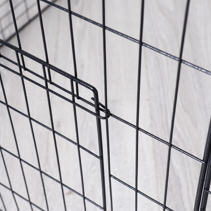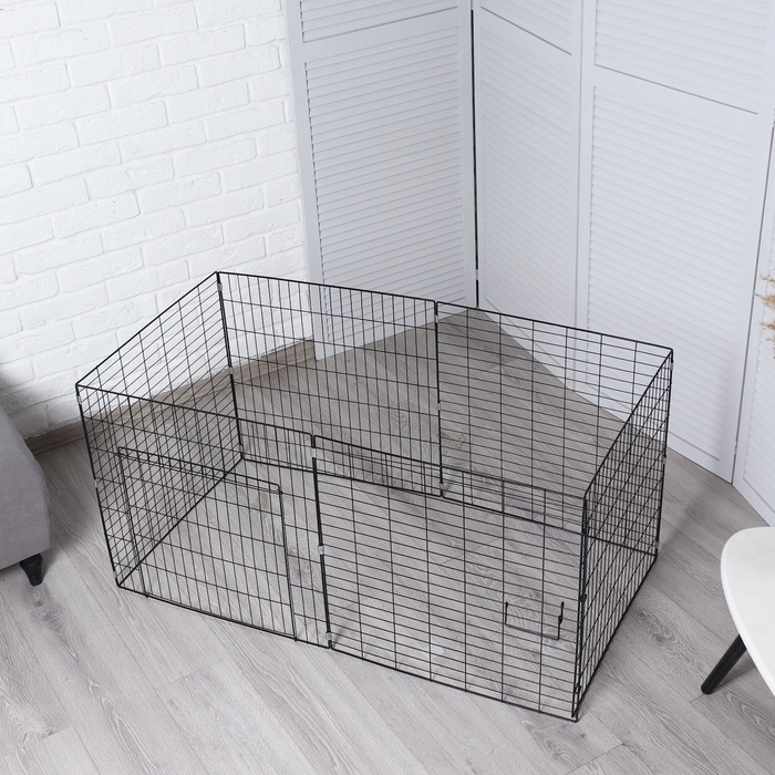 Вольер (клетка) сделан из негнущихся металлических секций, его можно быстро собрать и разобрать на открытом воздухе или в квартире без каких-либо дополнительных инструментов. Съемная конструкция складных перегородок разборного домика позволяет формировать квадратную, прямоугольную или любую неправильную форму.