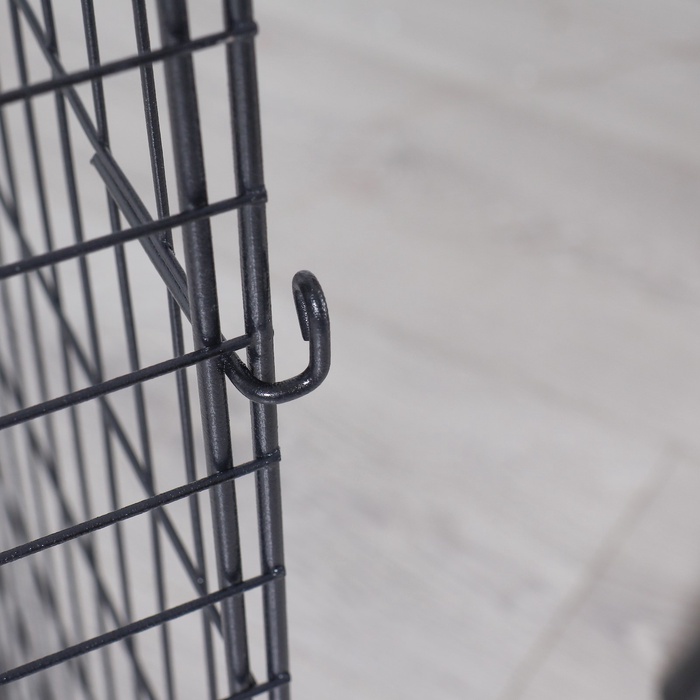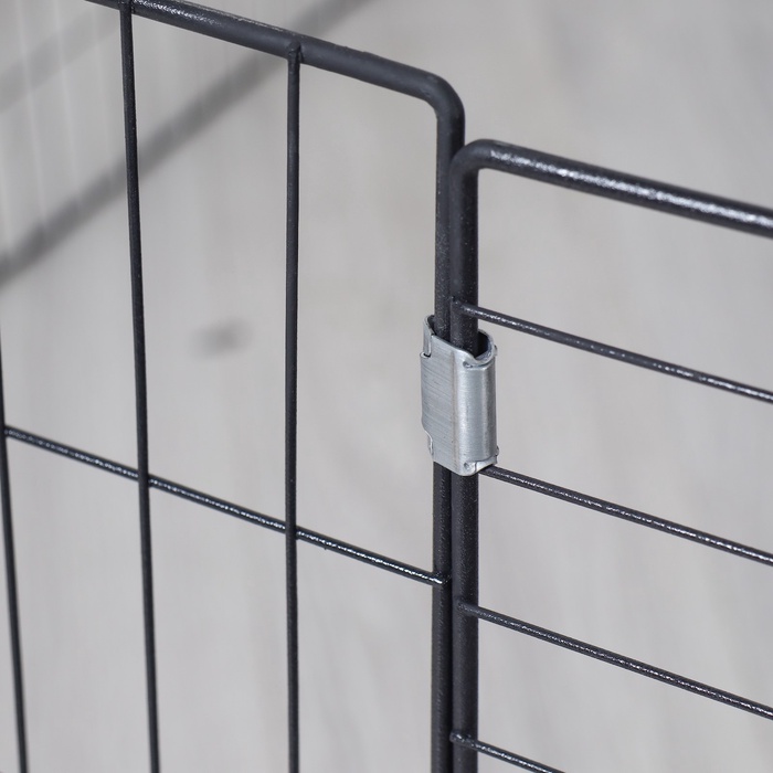 Вольер имеет две скользящие защелки с надежным замком, что означает, что ваш домашний любимец не сможет самостоятельно открыть дверцы вольера. Панели вольера надежно скрепляются соединительными стержнями по всей длине.
