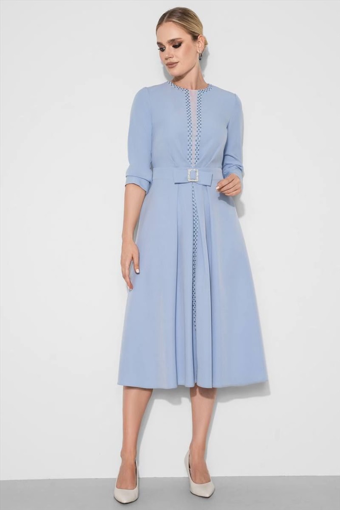 Платье отрезное по линии талии с втачным поясом по переду и спинке. Верхняя часть переда платья с втачной отделочной деталью посередине. По лифу вдоль отделки выполнена декоративная вышивка. От шва притачивания пояса к лифу заложены складки. Втачной пояс переда оформлен бантом с декоративной пряжкой-протяжкой (размер и форма пряжки может незначительно отличаться от пряжки на фото). Нижняя часть переда со средним швом, вдоль шва выполнена декоративная вышивка. По низу среднего шва переда обработан разрез. По нижней части переда, от шва притачивания пояса заложены складки.