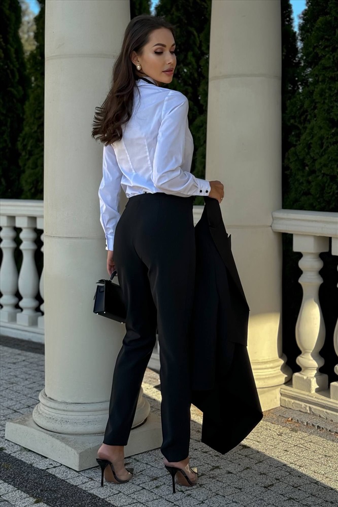 Брюки женские прямые. На задних половинках брюк обработаны талиевые вытачки. На передних полотнищах брюк в шве притачивания пояса обработаны карманы с листочкой. Верхний край брюк обработан притачным узким поясом-обтачкой. Брюки застёгиваются спереди на тесьму-молнию и брючный крючок на поясе брюк. ЖАКЕТ, БРЮКИ: костюмно-плательная БЛУЗКА: рубашечная ЖАКЕТ, БРЮКИ: полиэстер 62%, вискоза – 34%, спандекс – 4% БЛУЗА: хлопок 76%, полиэстер 22%, эластан 2%