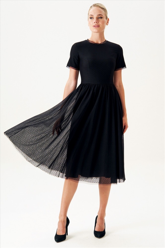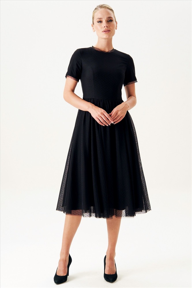 Страна производитель: Республика Беларусь Комплектация: Платье Сезон: Круглогодичный Коллекция: Праздничная Стиль: Нарядный Цвет: черный Материал: текстиль Состав: полиэстер - 64%, вискоза - 33%, спандекс - 3 Рост: 164 см Адрес изготовителя: г. Брест, ул. М. Богдановича, 50 Описание: Представляем вашему вниманию роскошное черное фатиновое платье, воплощающее в себе идеальный баланс между элегантностью и чувственностью. Изготовленное легкого фатина, это платье создает невесомый, воздушный образ, который непременно притянет к себе восхищенные взгляды. Ощущайте себя уверенно и привлекательно в этом платье, притягивая восторженные взгляды окружающих. Платье женское многослойное, с притачной по горловине и низу рукава узкой отделочной деталью из сетки, силуэта песочные часы, отрезное по линии талии, длиной миди. Верхний слой платья из отделочного материала - сетка, нижний слой - легкая плательная ткань. Верхняя часть переда и спинки (лиф) с рельефами, выходящими из проймы и идущими до линии талии. Нижняя часть платья (юбка) многослойная, расклешенная книзу. Верхний слой юбки состоит из двух слоев сетки. В шве притачивания юбки к лифу - сборка. Спинка платья со средним швом, в котором обработана застежка на потайную тесьму-молнию. Рукава втачные одношовные, короткие. Горловина круглой формы обтачная. Это платье идеально сочетается с жакетом 22-507-1. Длина по среднему шву спинки до талии - 38,0 см (±1,0 см), Длина по среднему шву спинки до низа - 81,0 см (±3,0 см), Длина рукава - 20,0 см (±1,0 см). Цвет: черный в рубчик. Тип ткани на платье: плательно-блузочная. Комментарии к товару