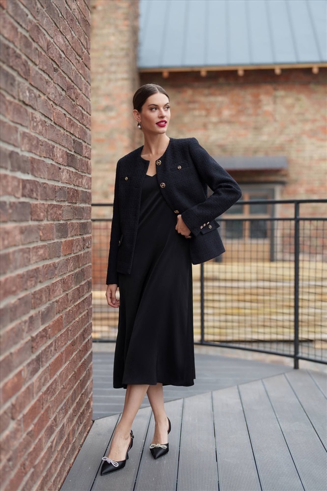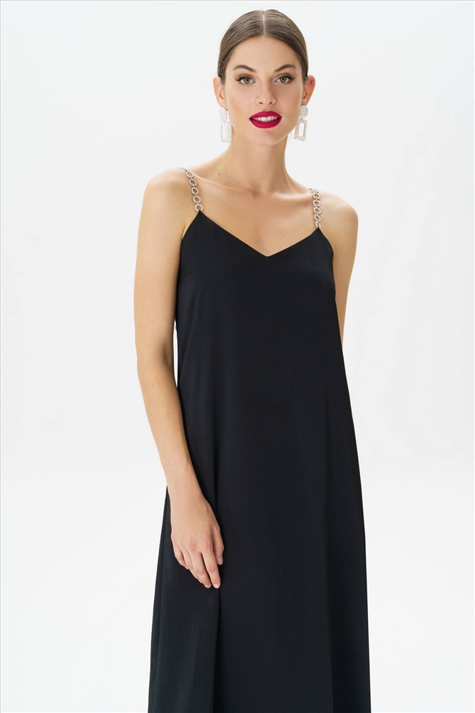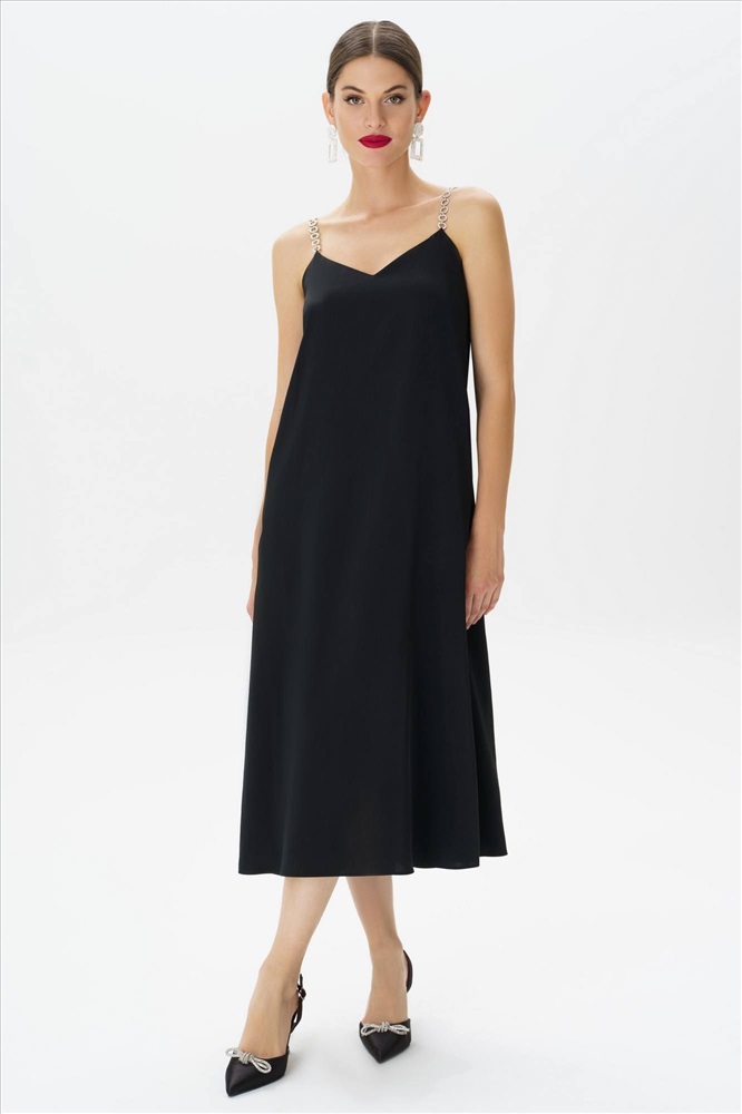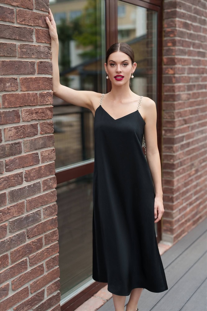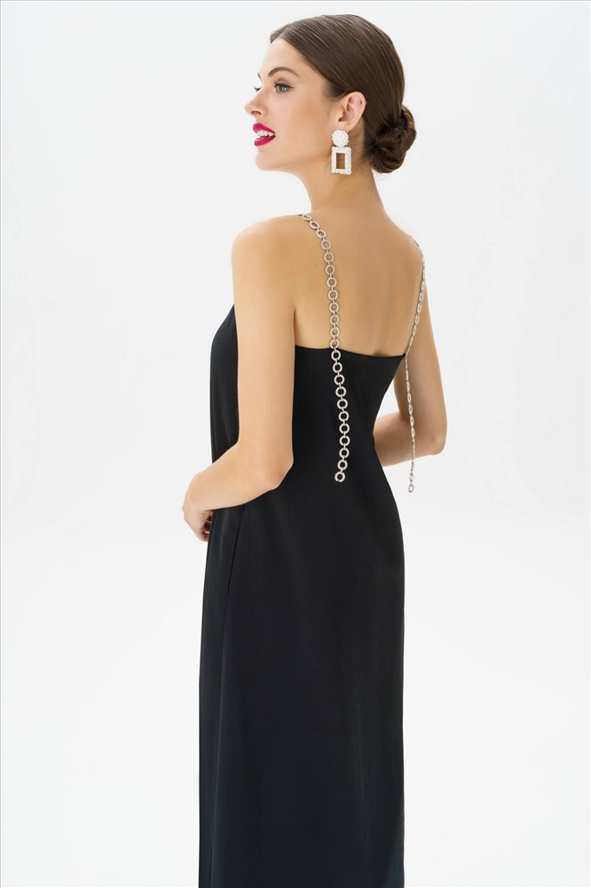 Это черное платье с бретельками, украшенными стразами, станет идеальным выбором для создания изысканного и элегантного образа. Фасон подчеркнет вашу фигуру, а открытые плечи придадут образу женственности и загадочности.В этом великолепном наряде вы непременно окажетесь в центре внимания и будете выглядеть стильно и безупречно.