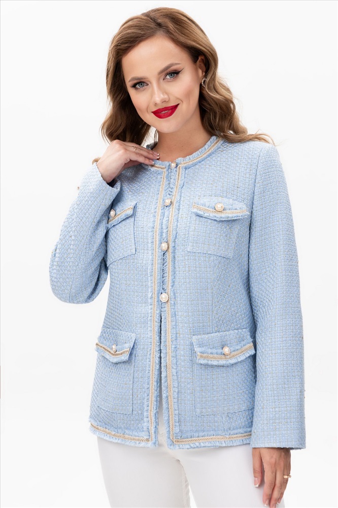 Страна производитель: Республика Беларусь Комплектация: Жакет Сезон: Лето Коллекция: Лето Стиль: На каждый день Цвет: голубой Материал: текстиль, твид Состав: акрил - 50%, полиэстер - 22%, вискоза - 22%, люрекс - 6%. Рост: 164 см Адрес изготовителя: г. Брест, ул. М. Богдановича, 50 Описание: Элегантный твидовый жакет, выполненный в неподражаемом стиле Chanel, придаст вашему образу роскоши и изящества. Отделка из тесьмы подчеркивает его современный, но в то же время классический стиль, который будет актуален во все времена. Носите его в паре с любимыми джинсами или же с юбкой-карандаш для создания неповторимого делового образа. Жакет женский из костюмной текстурированной ткани на подкладке, с центральной бортовой застежкой встык на 4 навесных петли и пуговицы (размер и цвет фурнитуры может незначительно отличаться от фото). Перед жакета с талиевой вытачкой, идущей от низа изделия до центра груди. На переде расположены 2 пары накладных карманов с клапанами, вверху на уровне линии груди и немного ниже линии талии, на клапанах пришиты пуговицы (декоративный элемент). Углы кармана прямые, клапаны фигурной формы. Спинка со средним швом и талиевыми вытачками. Рукава втачные двухшовные, длинные. Горловина круглой формы, обтачная. Линия борта прямая. Край горловины, борт, клапаны и низ изделия оформлен бахромой и отделочной тесьмой. Жакет с плечевыми накладками. Состав изделия: акрил - 50%, полиэстер - 22%, вискоза - 22%, люрекс - 6%. Комментарии к товару