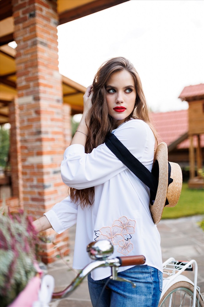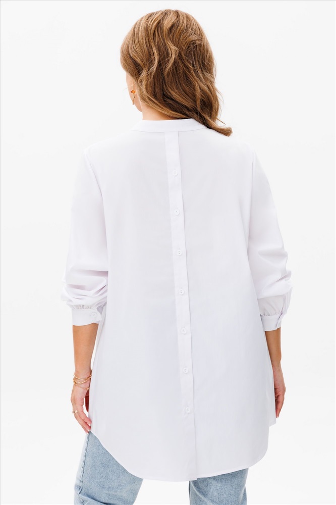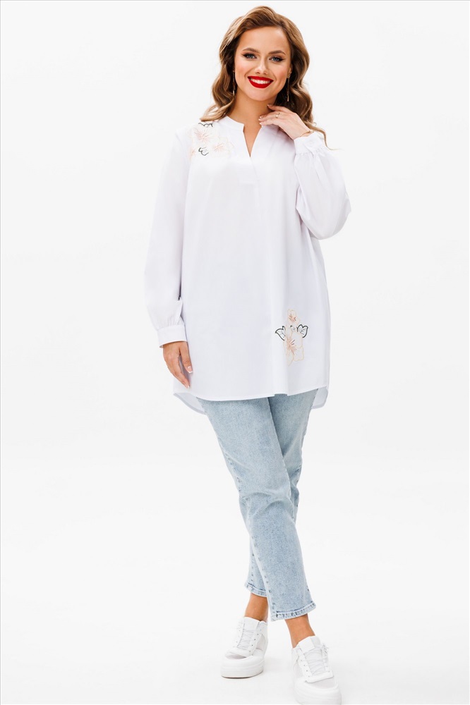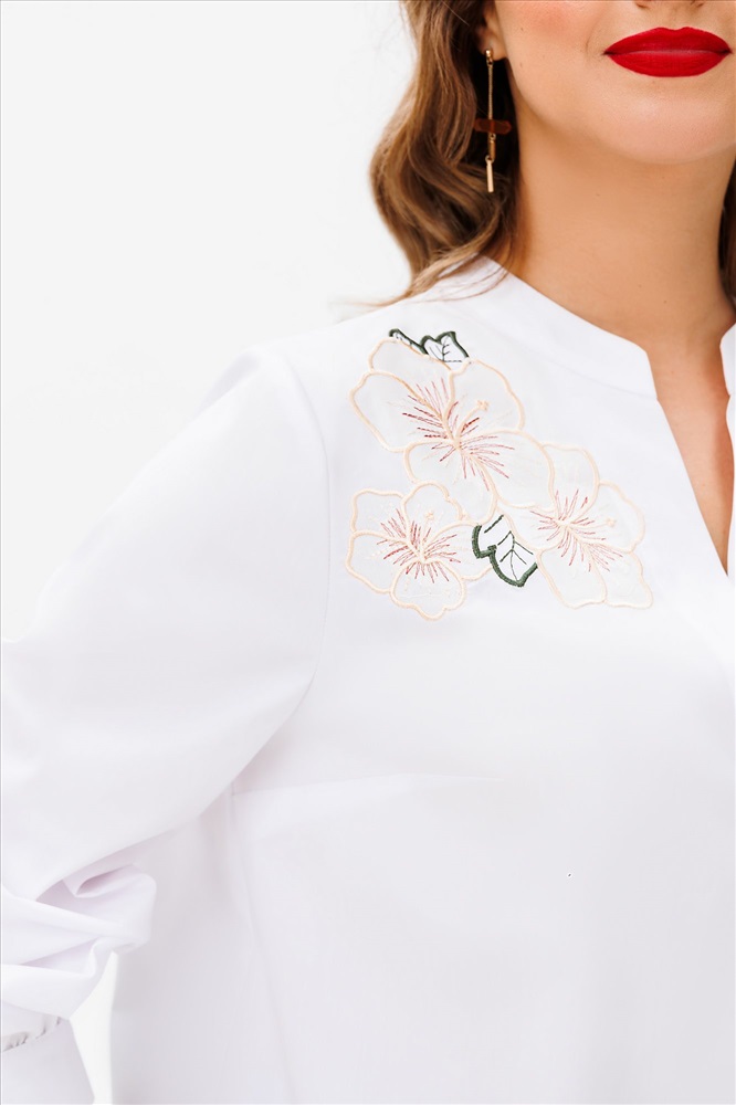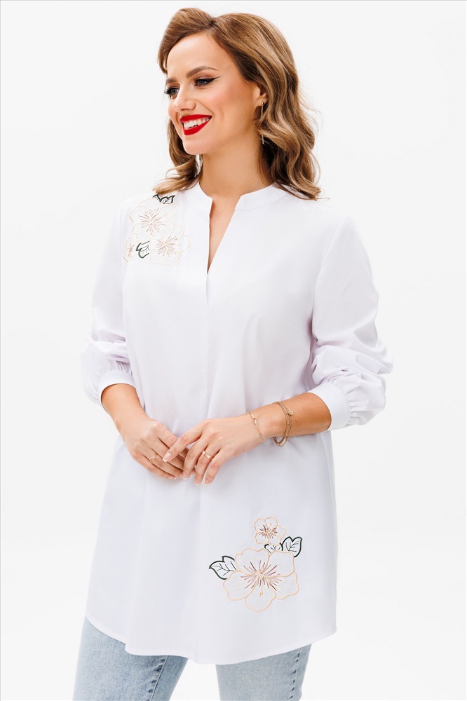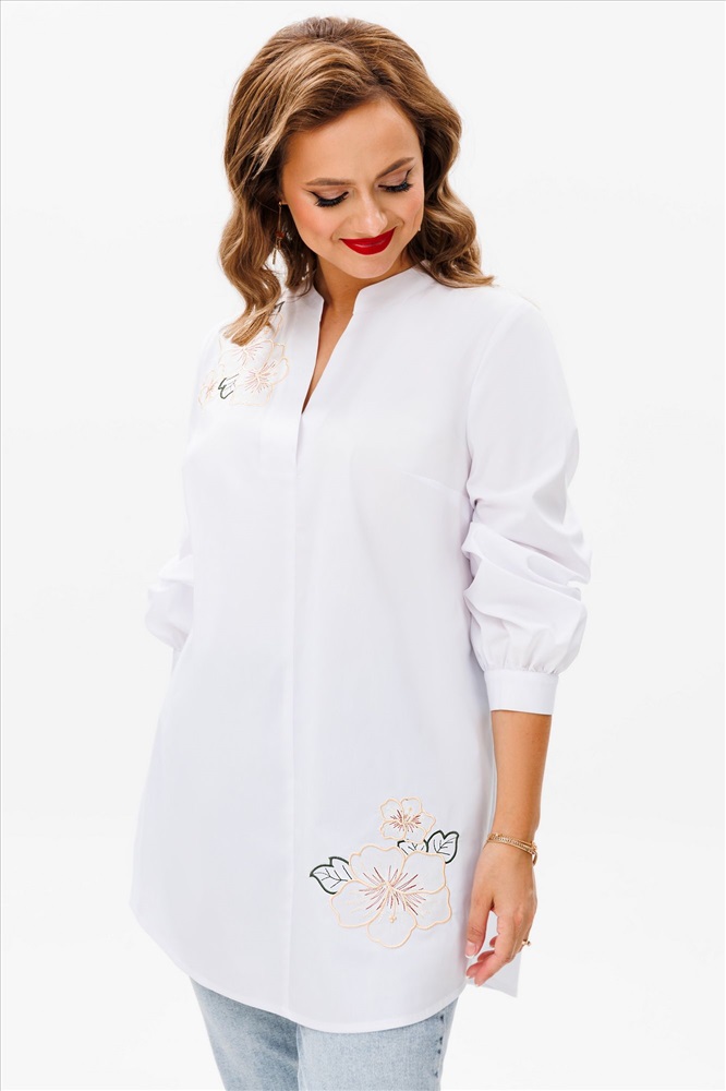 Блузка женская свободного силуэта, выполненная из лёгкой и приятной к телу блузочной ткани, создаёт стильный и комфортный образ. Верхняя правая и нижняя левая части переда украшены изящной вышивкой в виде цветов, добавляя изысканности и нежности. Изюминку блузки добавляет спинка с центральной функциональной застежкой идущей от воротника-стойки до низа. Эта блузка идеально сочетается с юбками, брюками и джинсами, позволяя экспериментировать с образами и подчёркивая индивидуальность.