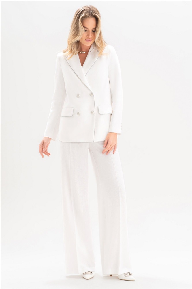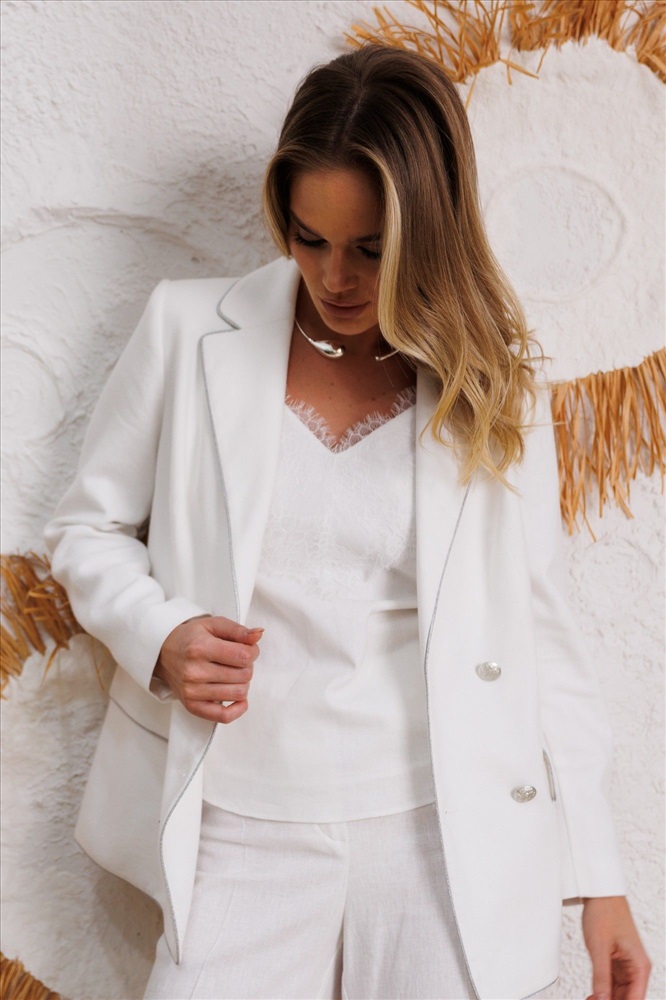 Этот белоснежный женский костюм из льна — идеальный выбор для тех, кто ценит сдержанную роскошь и натуральные ткани. Прямой двубортный жакет украшен изысканным кантом, подчёркивающим линии силуэта и придающим образу благородство. Изящные пуговицы с фактурным блеском дополняют стильный образ.