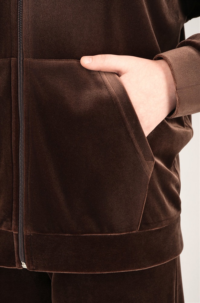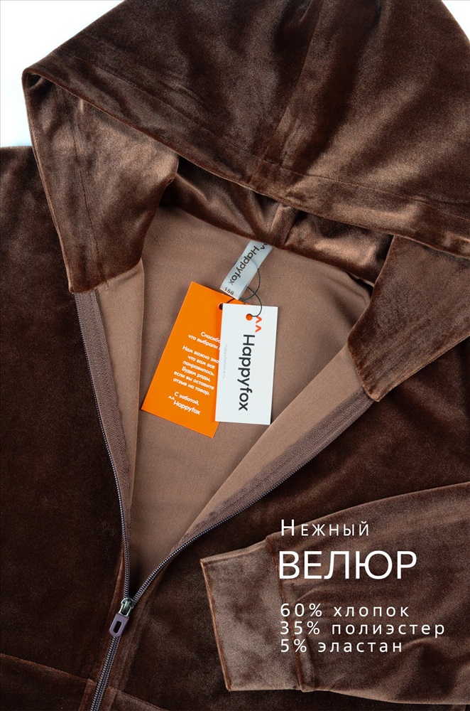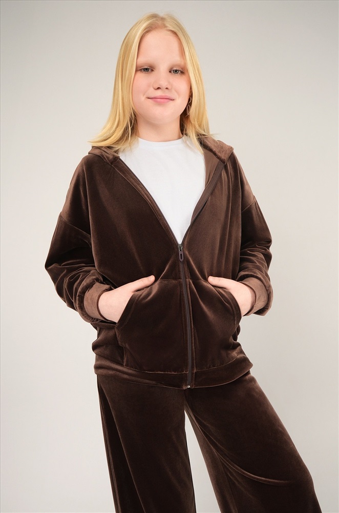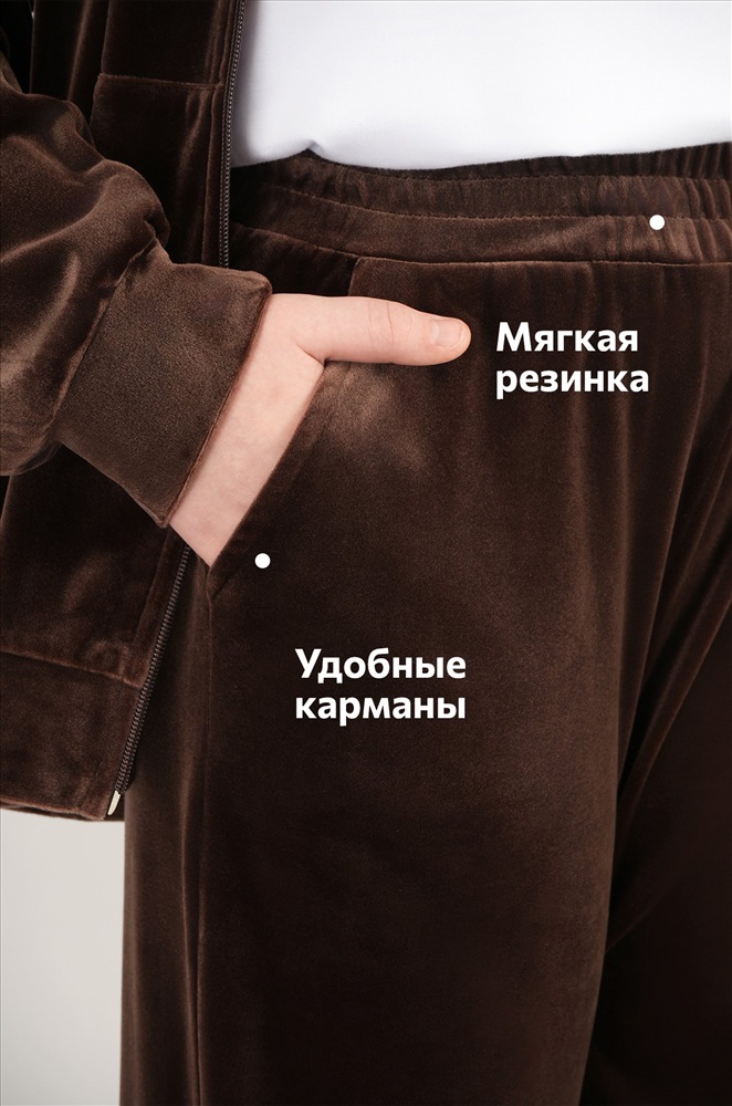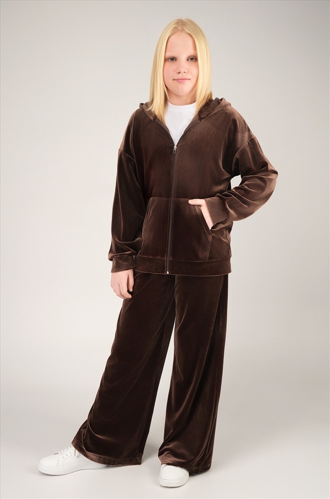 Преимущества: — приятный на ощупь трикотаж с высоким содержанием хлопка; — плотная, но дышащая структура велюра (250 г/м²) сохраняет тепло и мягкость; — худи оверсайз с объемным капюшоном и удобной молнией; — свободные брюки прямого кроя с мягким поясом на резинке; — манжеты на рукавах и карманы для максимального удобства; — однотонный лаконичный дизайн, который легко сочетается с другим гардеробом. Демисезонный костюм для детей и подростков сочетает в себе уют и стиль. Кофта-зипка и широкие штаны палаццо шоколадного цвета создают гармоничный детский комплект, идеально подходящий для активных будней, прогулок и домашних вечеров.