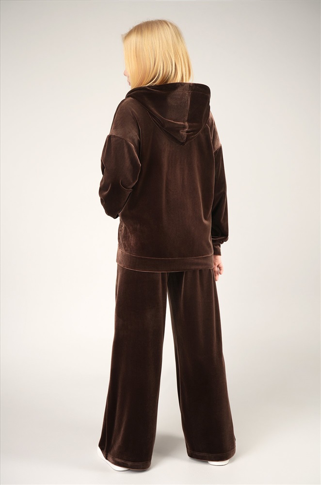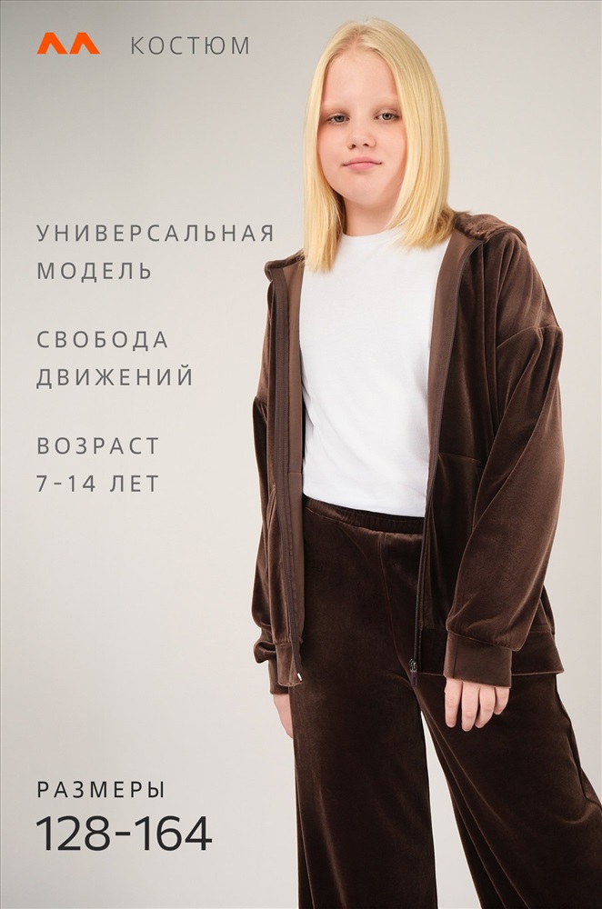 Коричневый костюм для девочки из мягкого трикотажного велюра дарит комфорт и уверенность в движении. Универсальный базовый комплект — отличный выбор для прогулок осенью и весной, отдыха и ярких моментов в спортивном стиле.
